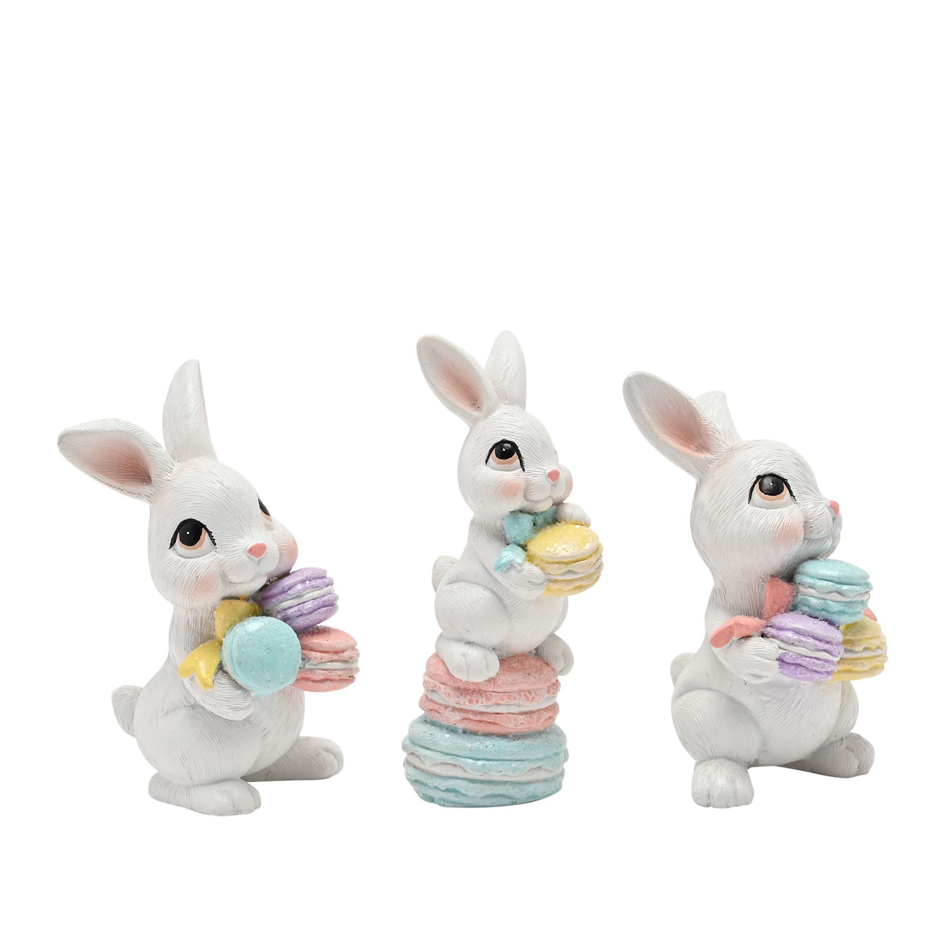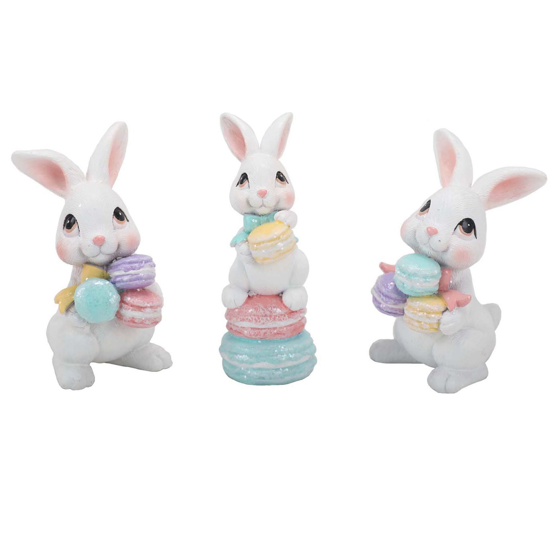 The Eggs-traordinary Gifting Co Bunny with Macarons Figurines features 3 playful bunny figurines each one holding a stack of pastel macarons.