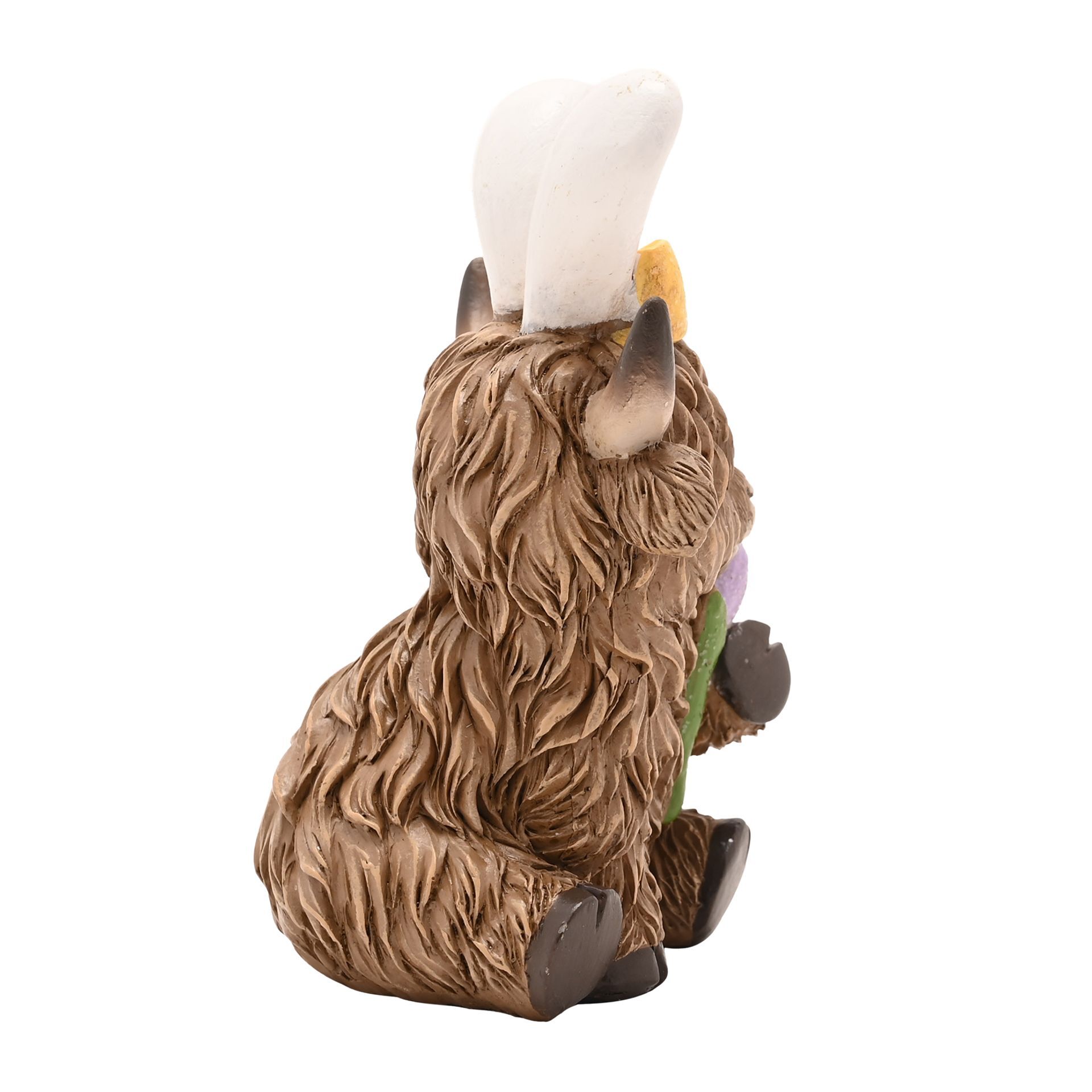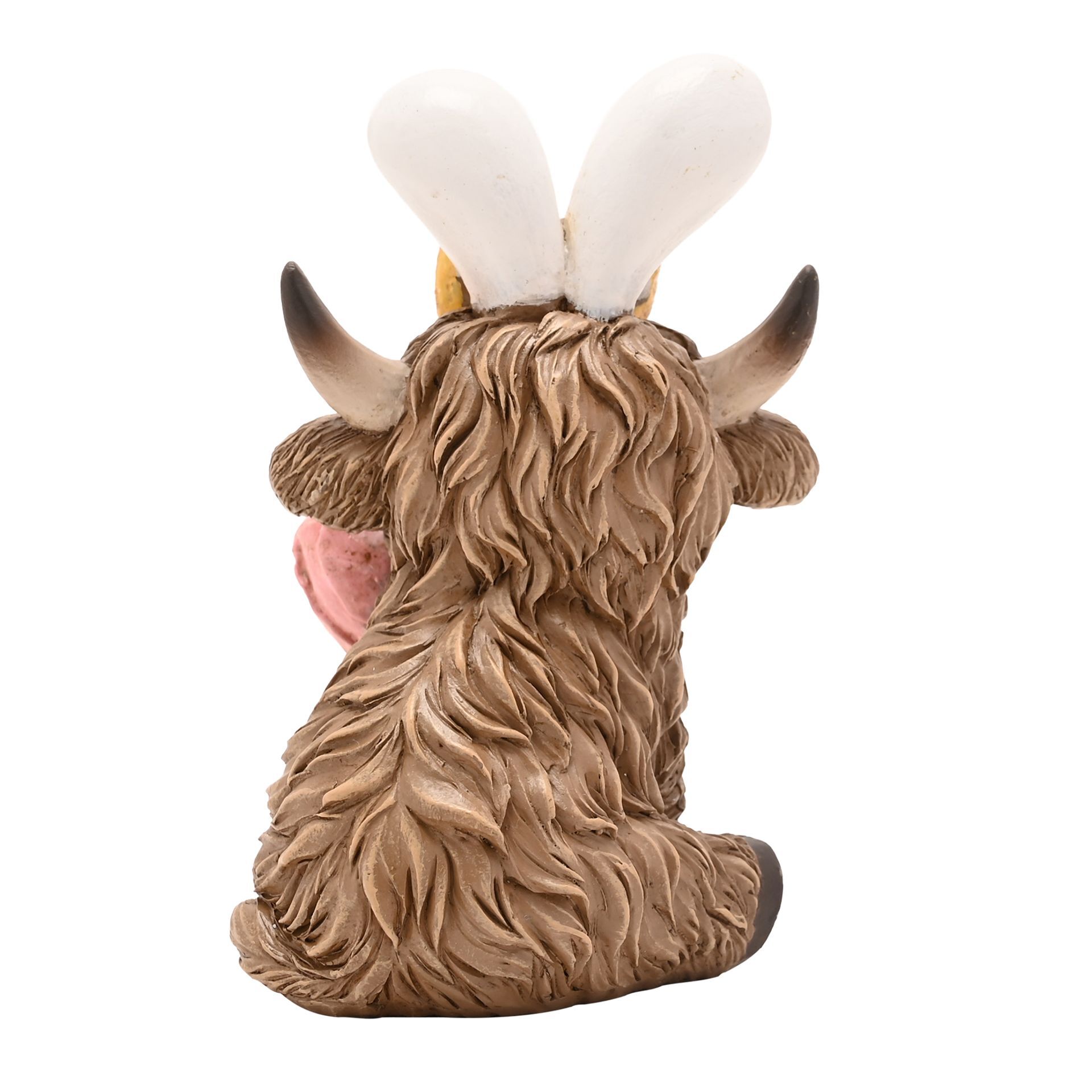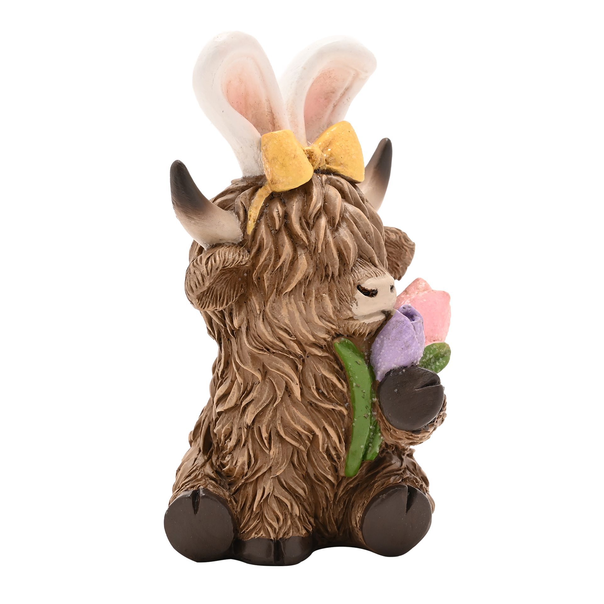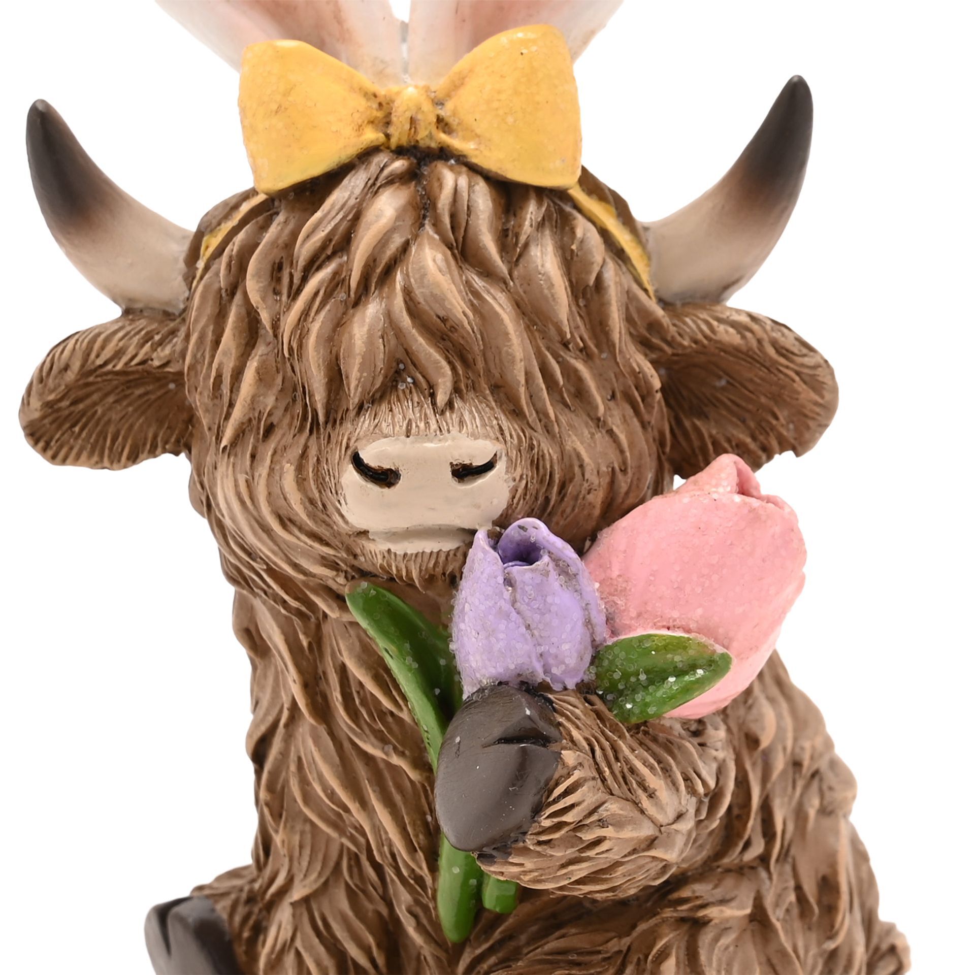 A seasonal update on a popular design, Eggs-traordinary Gifting Company Highland Cow Easter Bunny figurine features bunny ears, a yellow bow, and pastel spring flowers.