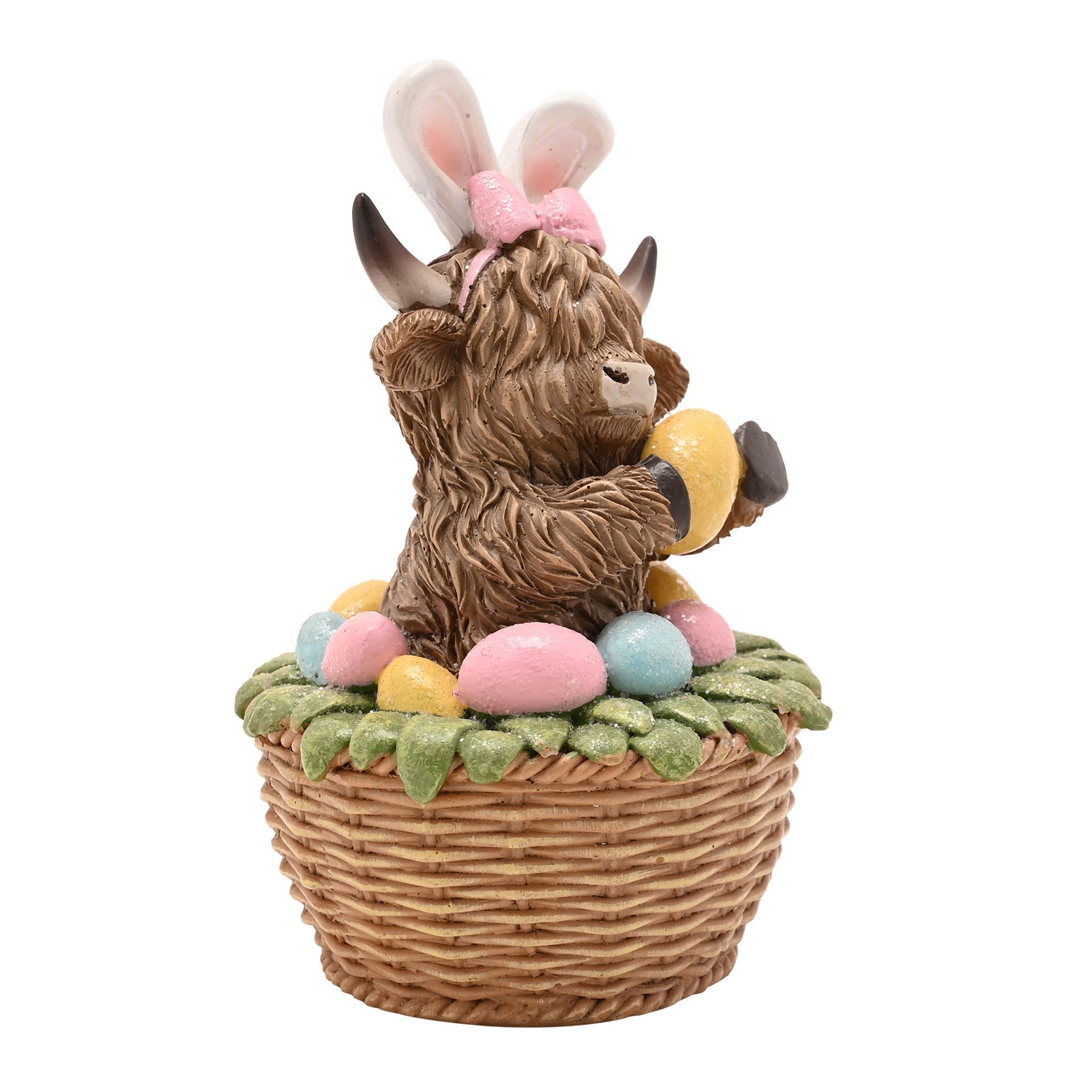 A seasonal update on a popular design, The Eggs-traordinary Gifting Co. Highland Cow in an Easter Basket figurine features the character with bunny ears.