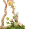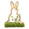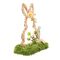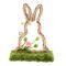 A woven rabbit-shaped sculpture on a grassy base, adorned with faux flowers and greenery, creates a whimsical, nature-inspired look.