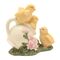 This design features three yellow chicks perched on a teapot, finished with pink flowers and green foliage.