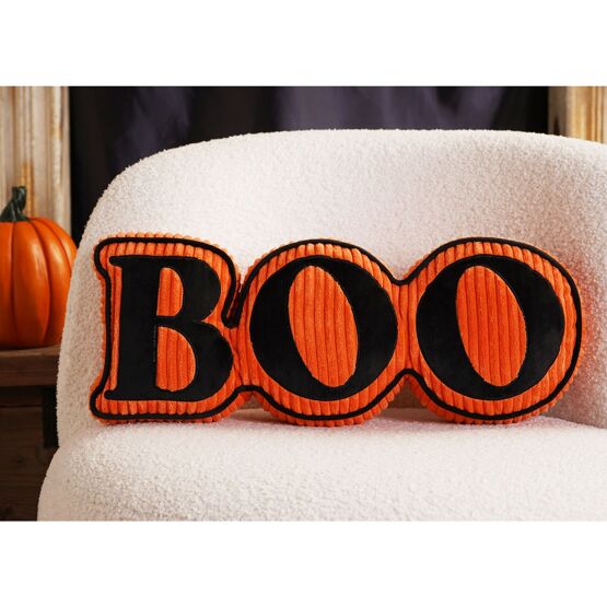 This Boo-shaped corduroy cushion offers a stylish nod to the spooky season, blending character with seasonal charm. Ultra-stylish and perfectly on trend, it features bold black Boo lettering outlined in vibrant orange, all crafted in a soft corduroy finish. A playful yet contemporary accent that adds texture, warmth, and unmistakable Halloween personality to any interior display.