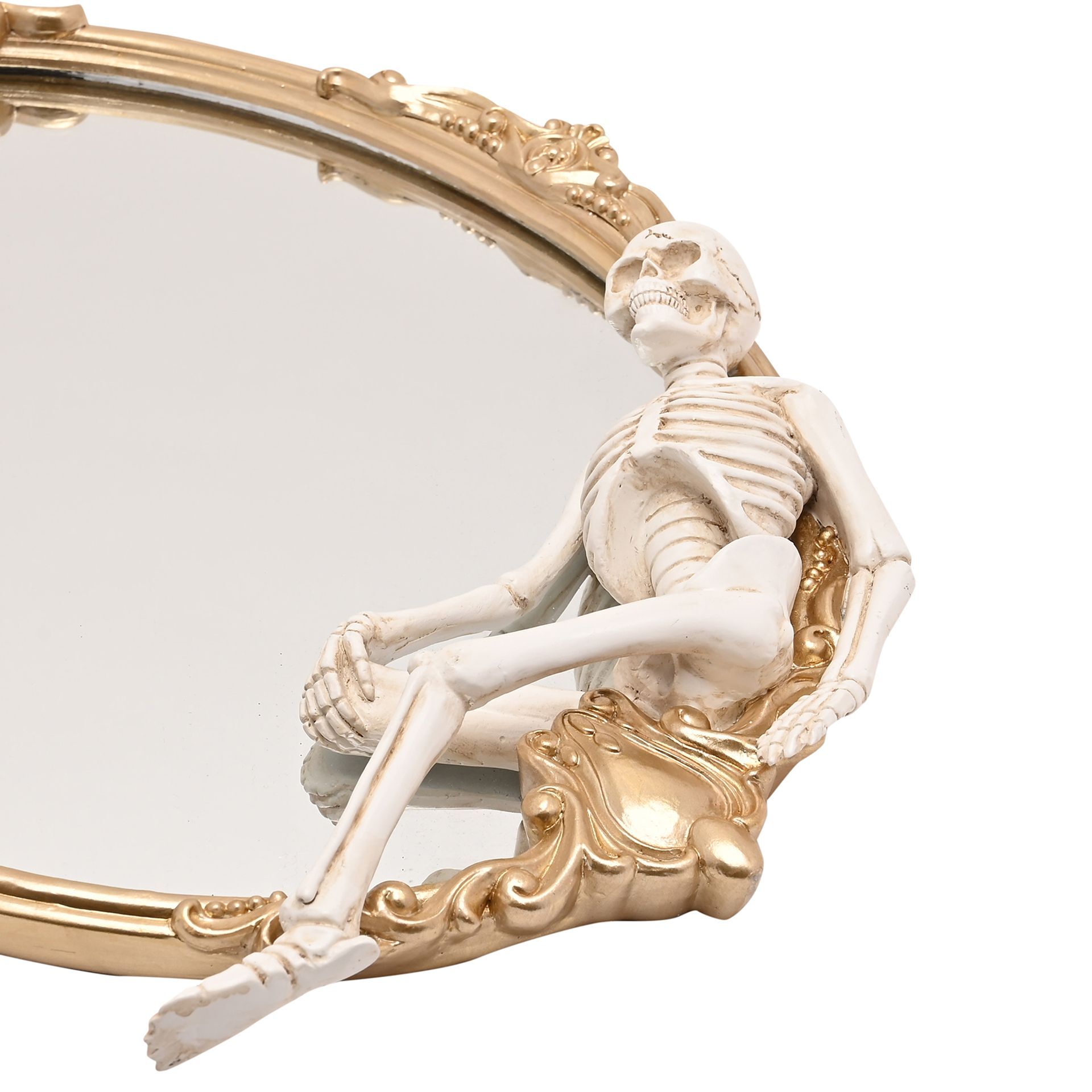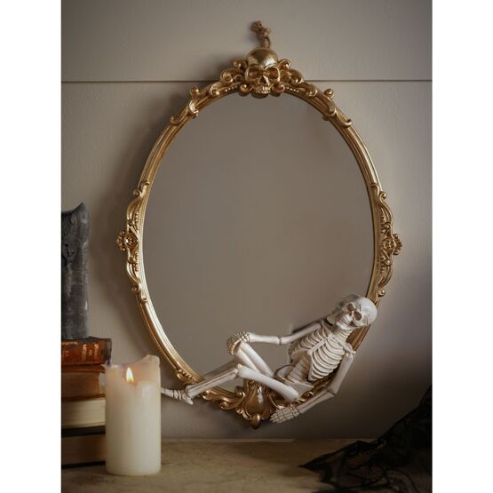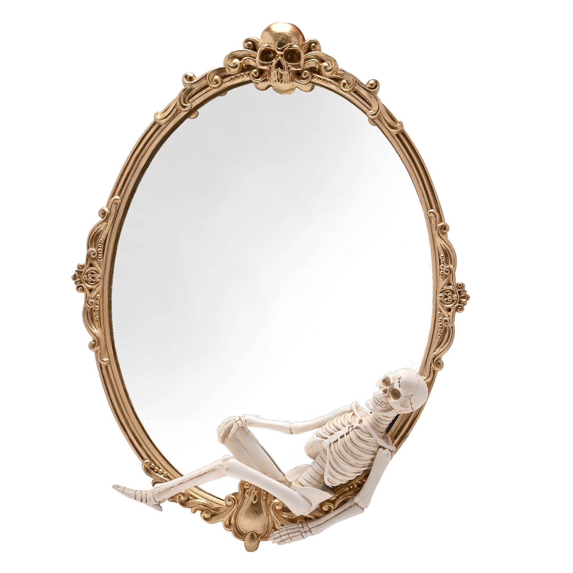 Introduce a subtle sense of Halloween magic with this gold wall mirror featuring a charming skeleton decoration. The decorative design brings a well-styled spooky touch to hallways, living spaces, or any area of the home in need of seasonal character.