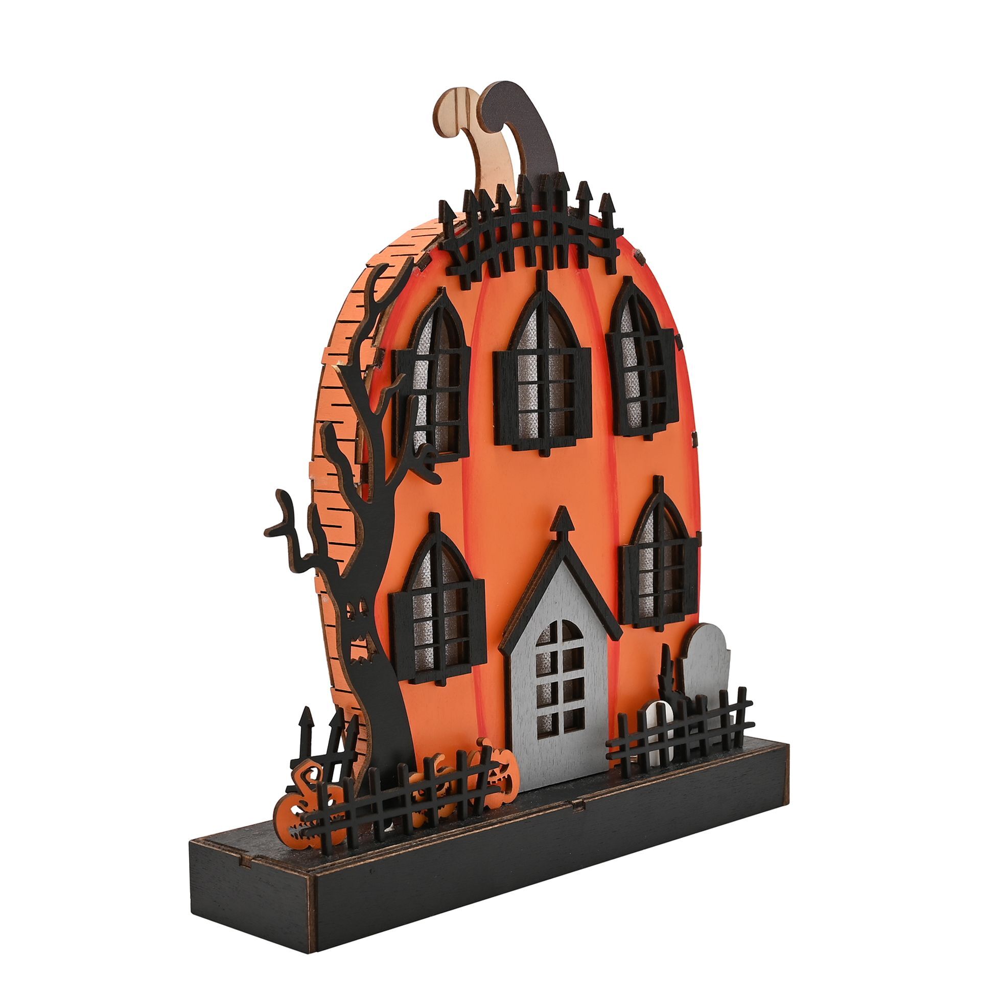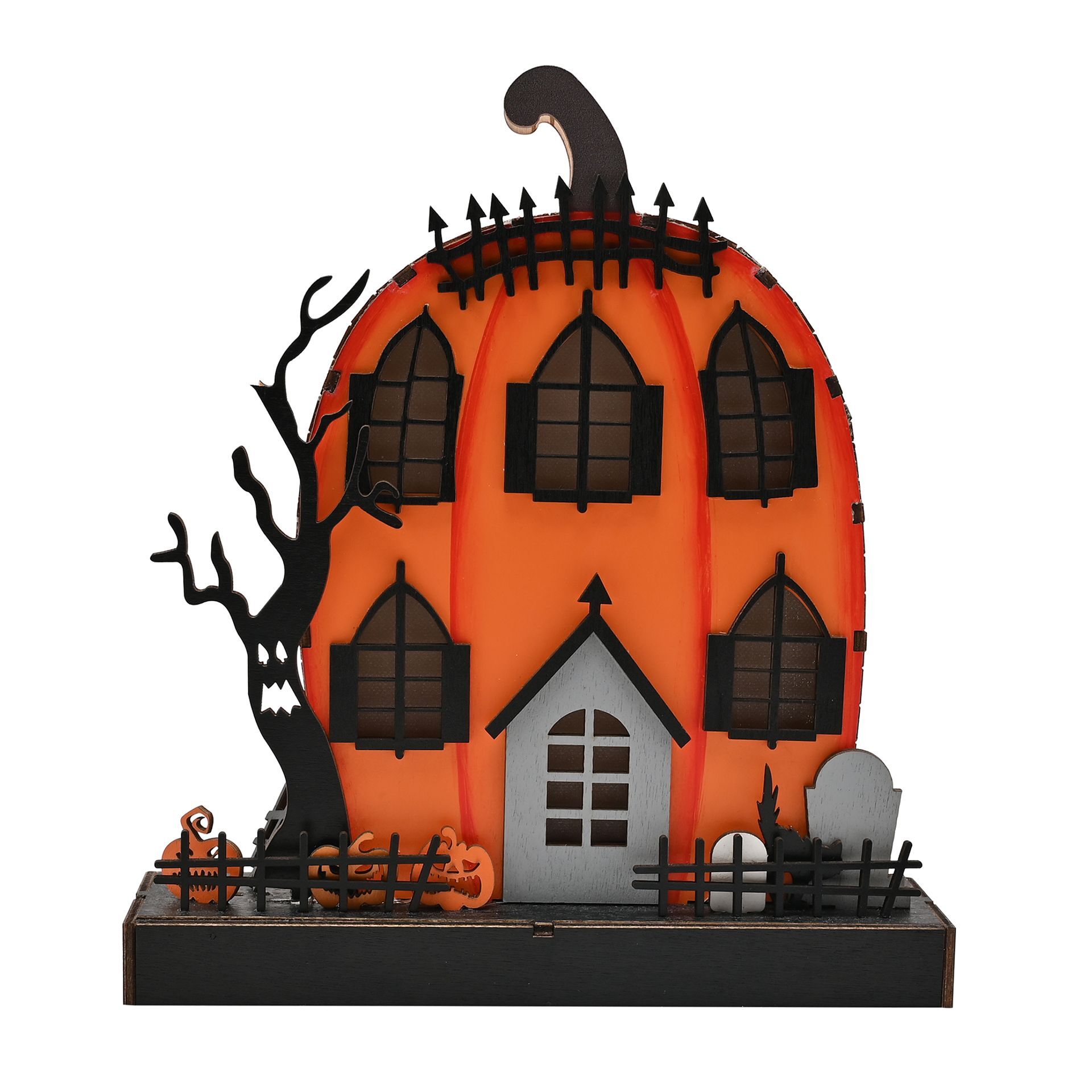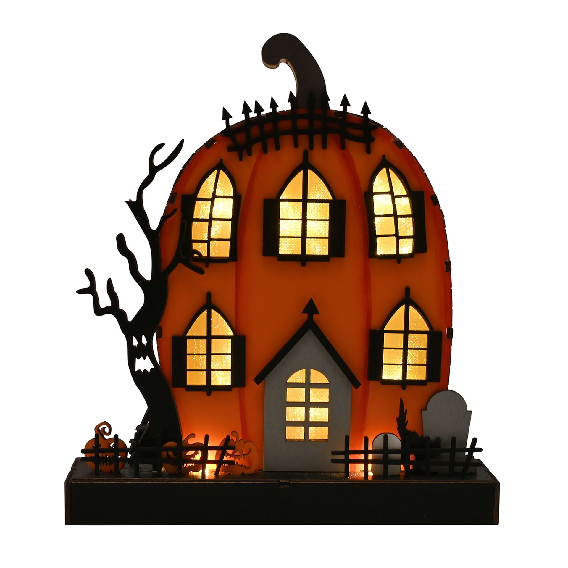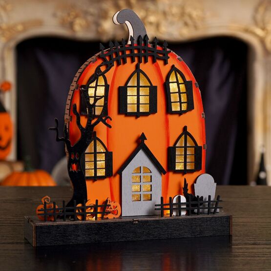 This Halloween LED light-up pumpkin (complete with a try-me button) offers a stylish nod to the spooky season, blending character with seasonal charm. Styled to resemble a whimsical pumpkin house with picket fencing, it delivers a delightful mix of cute and spooky. Its glowing interior adds atmospheric warmth, making it a charming highlight for any Halloween display.