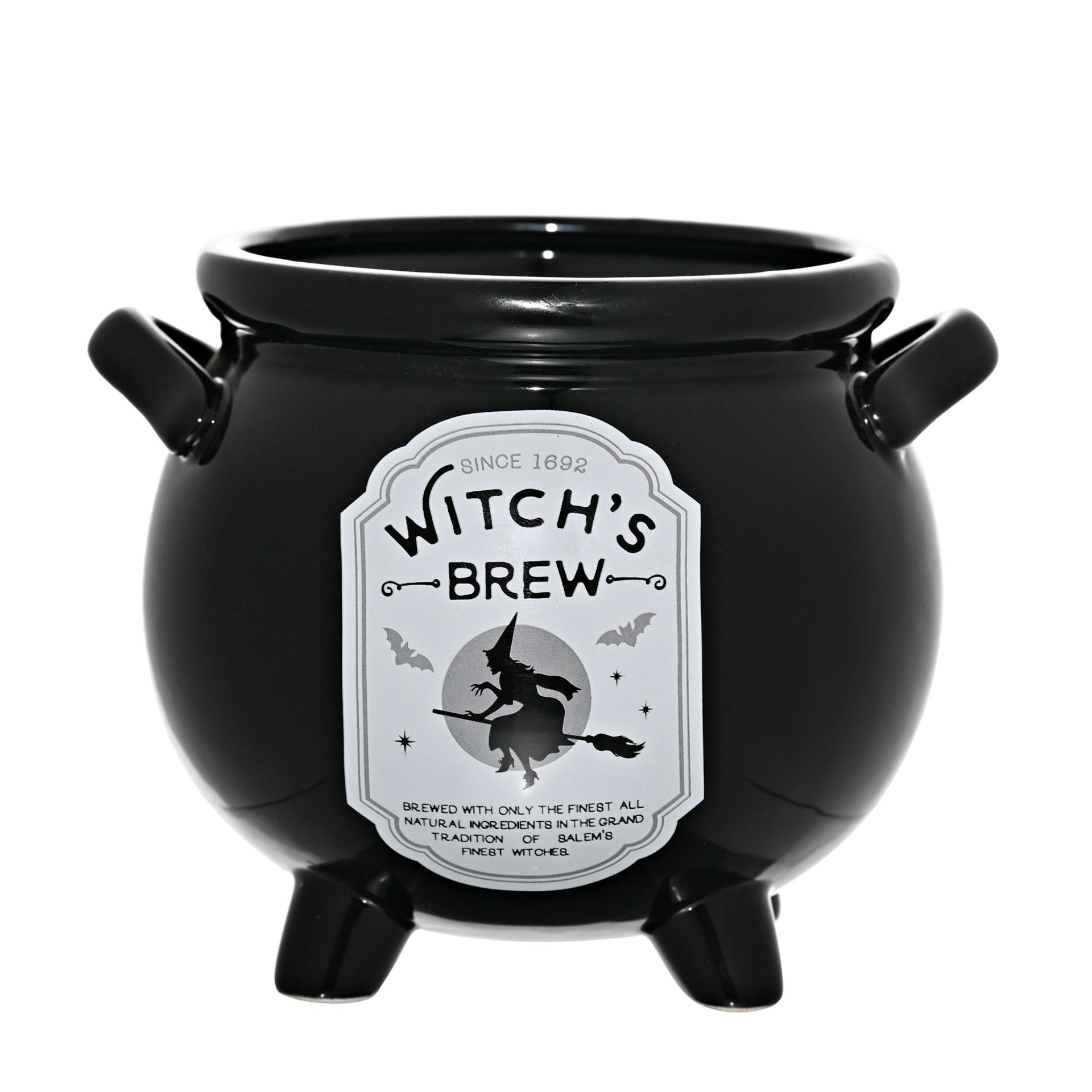 Immerse yourself in the mystic charm of this black ceramic cauldron. With its label reading "Witch's Brew" and a silhouette of a witch on a broomstick against a starry night sky. Perfect for holding flowers or as a standalone decoration, it adds a touch of magic to any room.