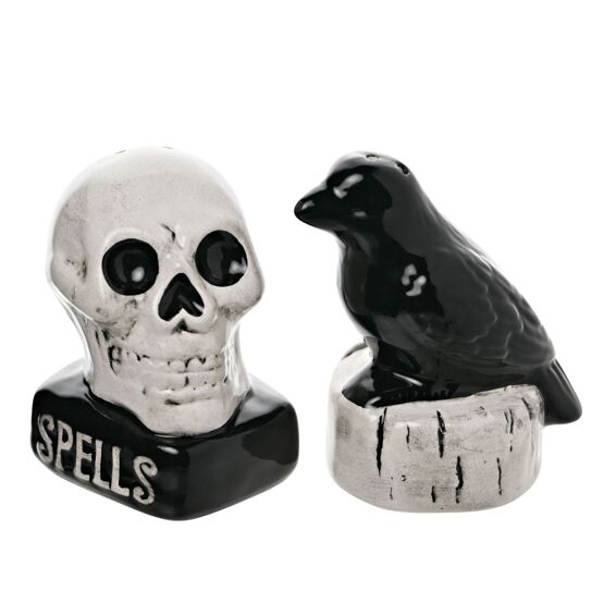 These playful shakers, shaped like a white skeleton and a black crow, add a dash of whimsy to any dining setting. Ideal for anyone with a fondness for the quirky, these pieces promise to make a Halloween meal an amusing affair.