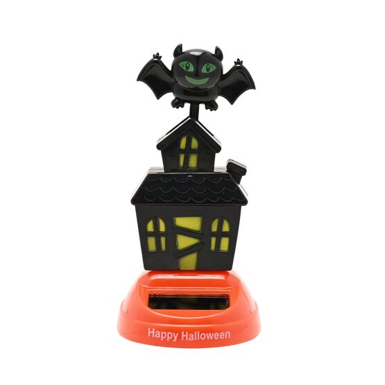 This solar-powered decoration features a charming black bat, perched atop a haunted house. This bat isn't just for show, it's a bobble head, bringing a touch of fun to the spooky season. Whether placed on a windowsill, mantle, or by the front door, it's sure to capture attention and ignite the Halloween spirit.