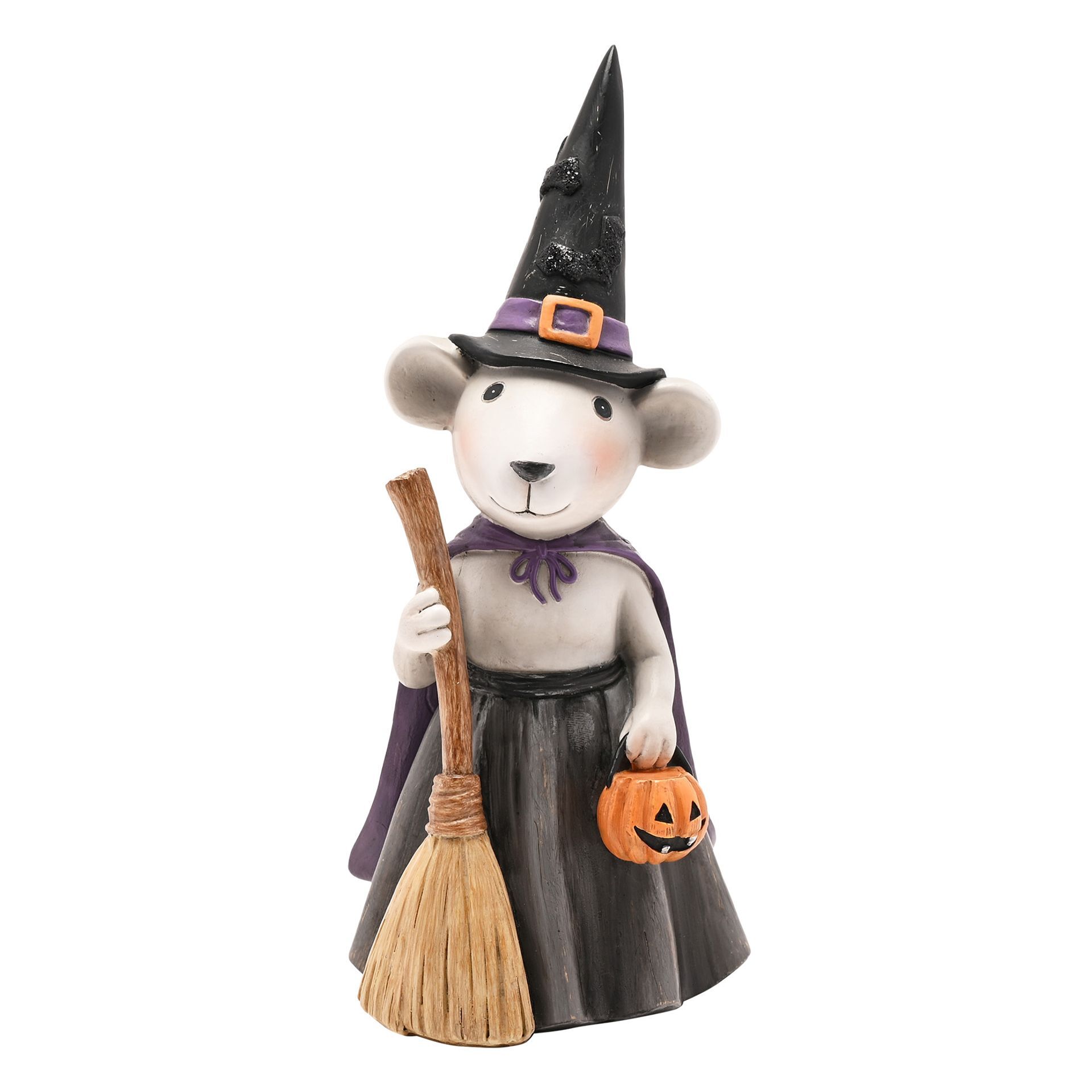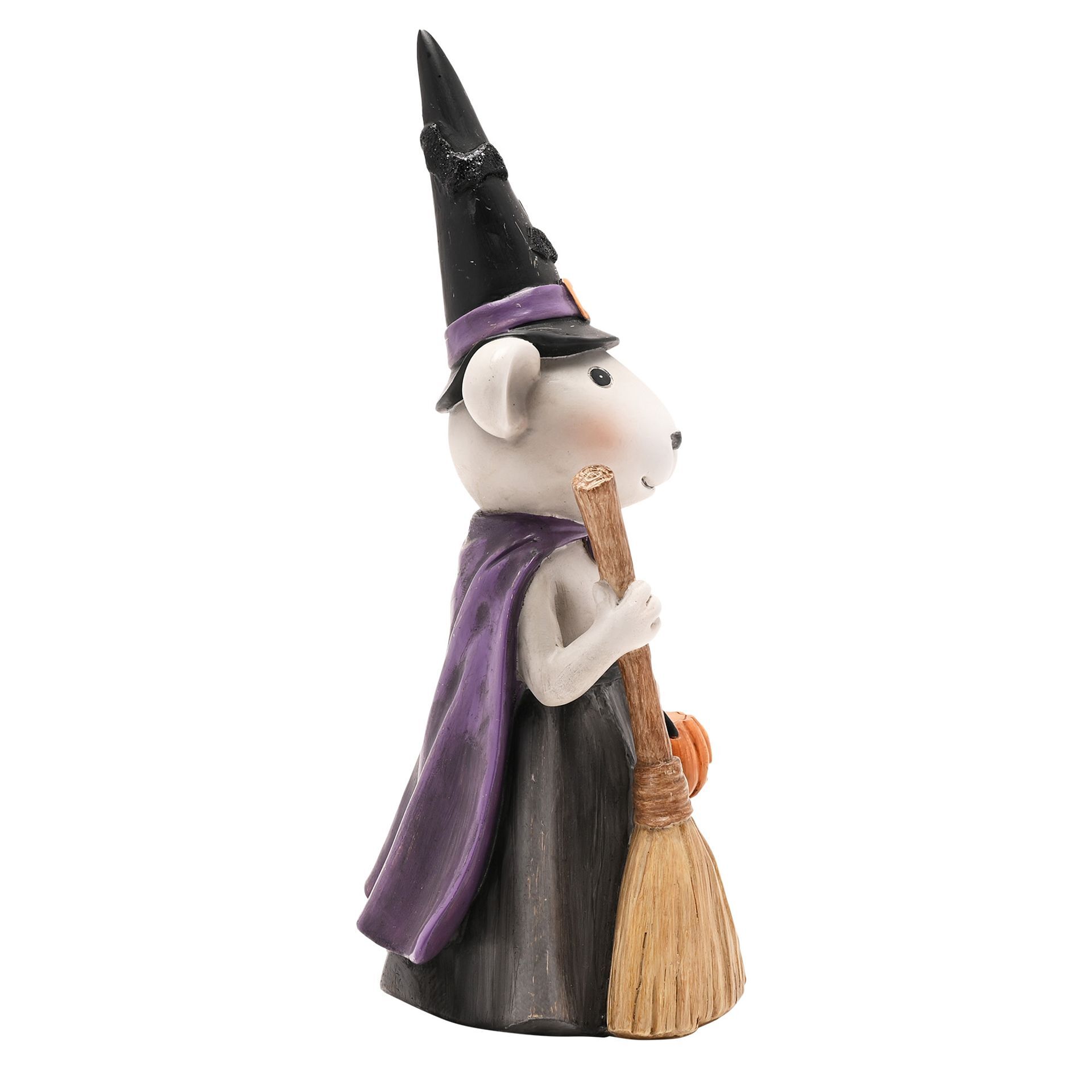 Dressed in a witch's hat and carrying a broom and a tiny pumpkin, this 25cm figurine is an adorable guest you'll want at a spooky soirée.