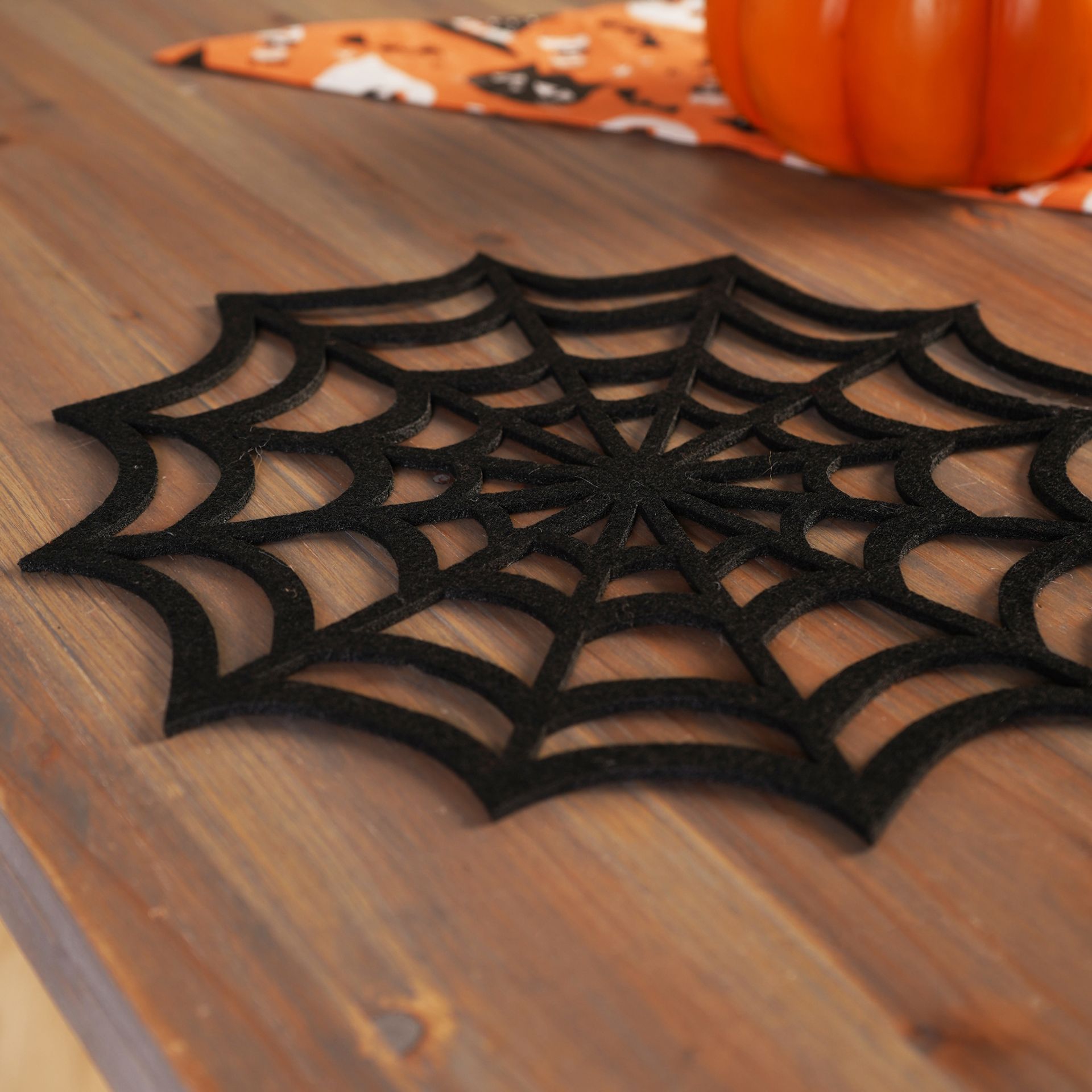 A charming addition to Halloween décor, this **multi 4** felt round placemat with spiders web pattern 30cm brings a touch of seasonal atmosphere. The design showcases a spiders web. A fitting choice for those wishing to enrich their Halloween décor theme.