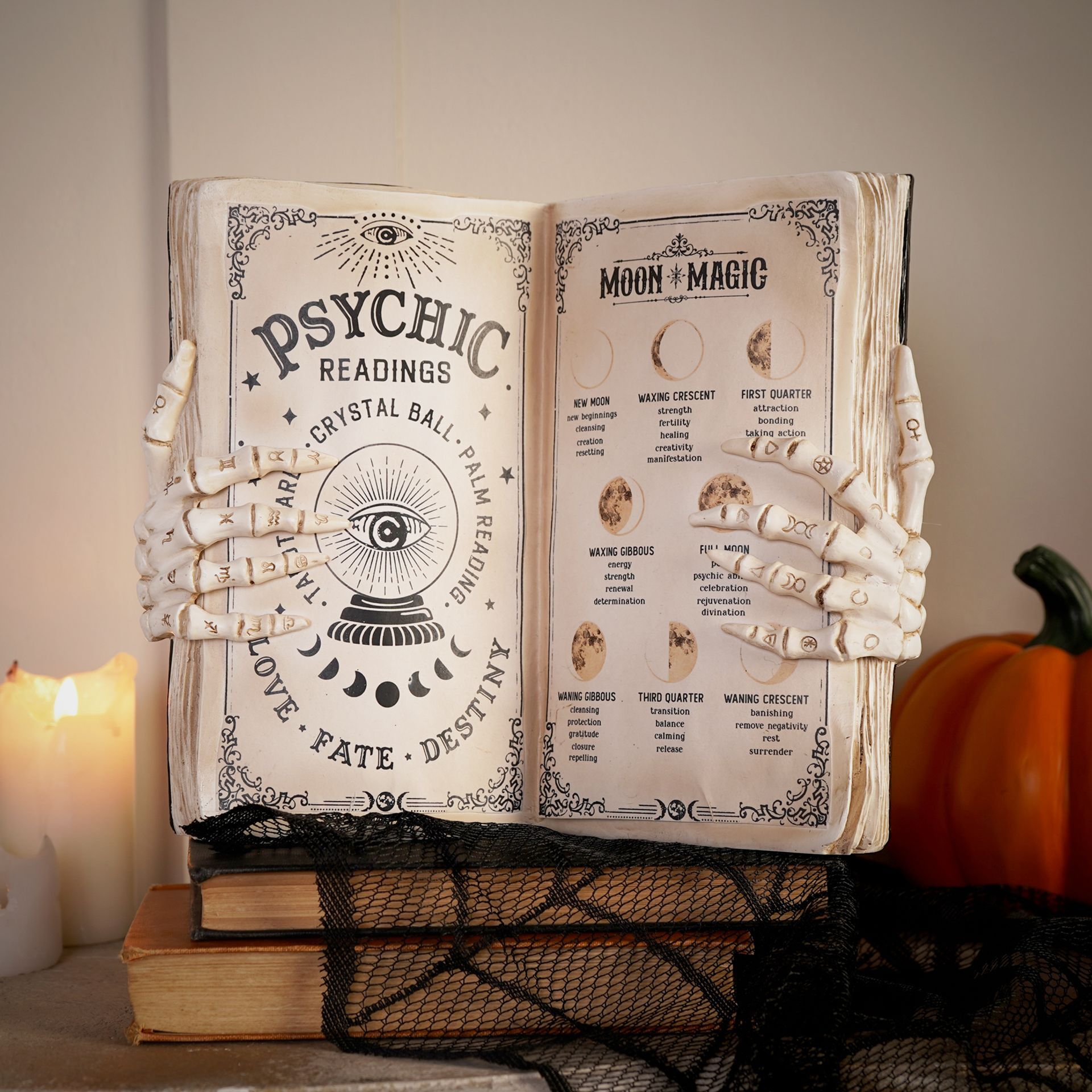 Celebrate the spirit of Halloween with this psychic reading book ornament, complete with skeletal hands for an extra spooky touch. Designed to sit strikingly on a shelf or display, it adds a mystical edge to seasonal décor. Pair with other coordinating spooky items from the collection to create a cohesive and atmospheric Halloween theme.