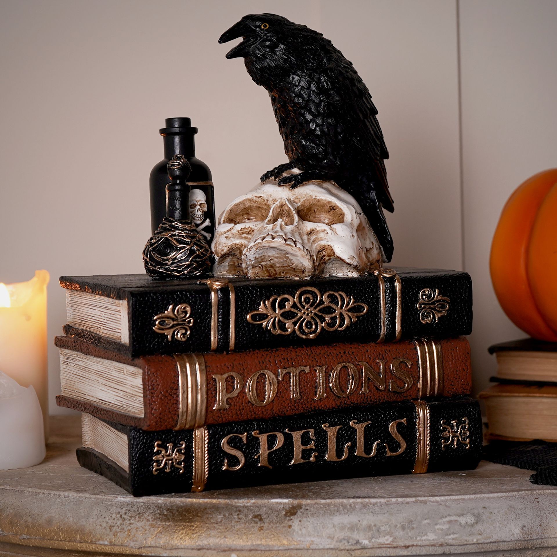Celebrate the spirit of Halloween with this raven standing on 3 potion bookstack, styled to capture the essence of the season. A versatile decorative item suited to a wide range of Halloween-inspired settings.