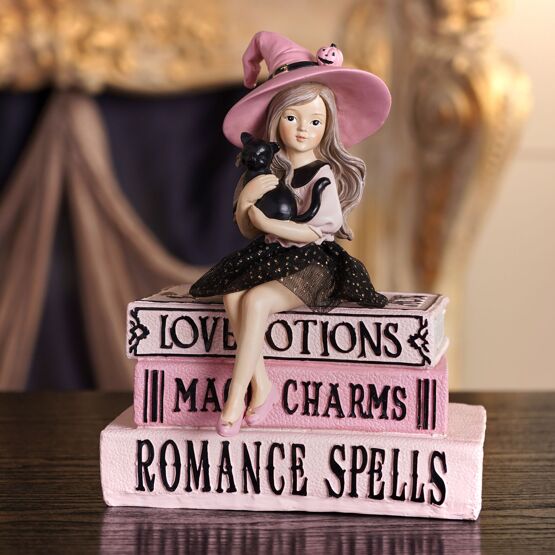 A charming addition to Halloween décor, this witch figurine atop a book stack brings a playful touch of seasonal atmosphere. Its detailed finish and thoughtful styling create a balanced blend of charm and subtle spookiness. The soft pink accents introduce a fresh and modern take on Halloween, adding personality and a standout twist to seasonal arrangements throughout the spooky season.