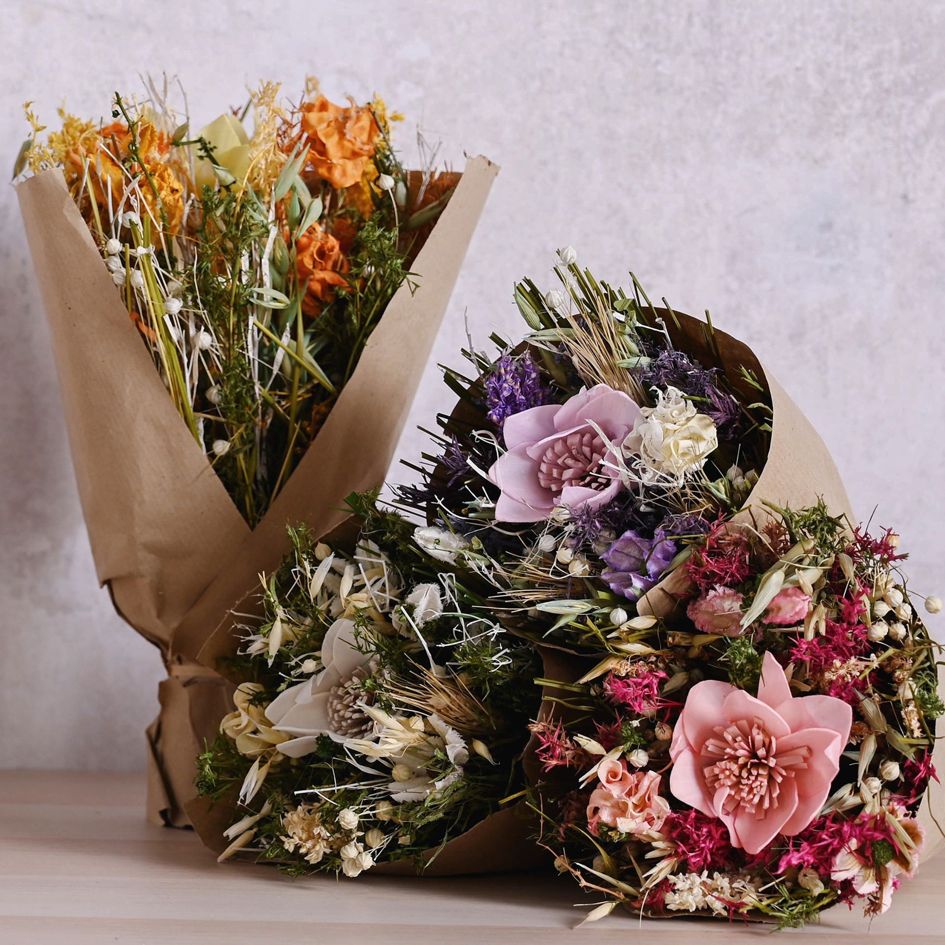An orange dried flower bouquet from Bloom by HESTIA®. This beautiful bouquet provides a desirable sample of nature for display in homes. The affectionately arranged dried flower bouquet showcases a selection of choice varieties and foliage. The bouquet includes a range of orange flowers with complementary colours. The bouquet is packaged in brown paper.