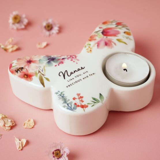 The Cottage Garden Butterfly Tealight Holder - Nana is a decorative ceramic piece shaped like a butterfly and finished with colourful floral detail. Designed to hold a single tealight, it reflects a soft glow that adds atmosphere to shelves, tables, or mantels.