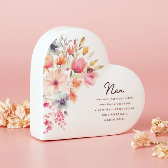 The Cottage Garden Ceramic Heart - Nan is a decorative keepsake designed to stand on shelves, desks, or bedside tables. Crafted in glazed ceramic, it features soft watercolour floral artwork paired with uplifting wording.