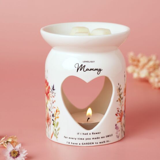 Each ceramic burner features a heart-shaped cut-out and delicate floral design, paired with heartfelt titles such as Mum, Mummy, Lovely, Friend, and Thank You. Simply add a wax melt to the dish and enjoy a cosy glow as the scent fills the room.