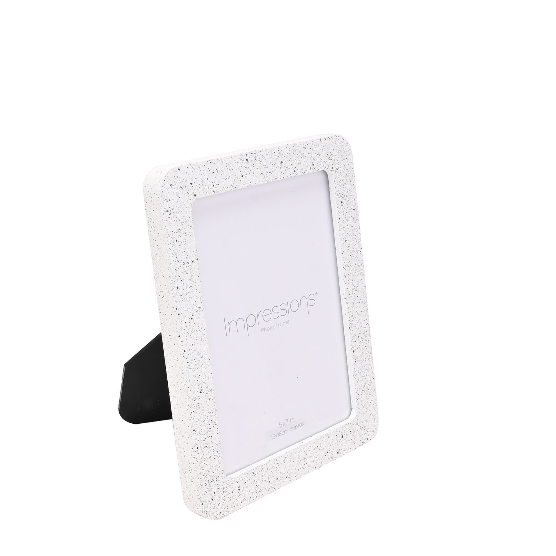 The white, photo frame showcases a speckled effect to its smooth texture. It is designed for portrait display using the attached standing strut.