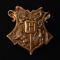 The large, gold resin shield showcases a metallic effect finish, complete with 3D Hogwarts shield design. It is designed for secure display using the attached wall hook brackets