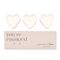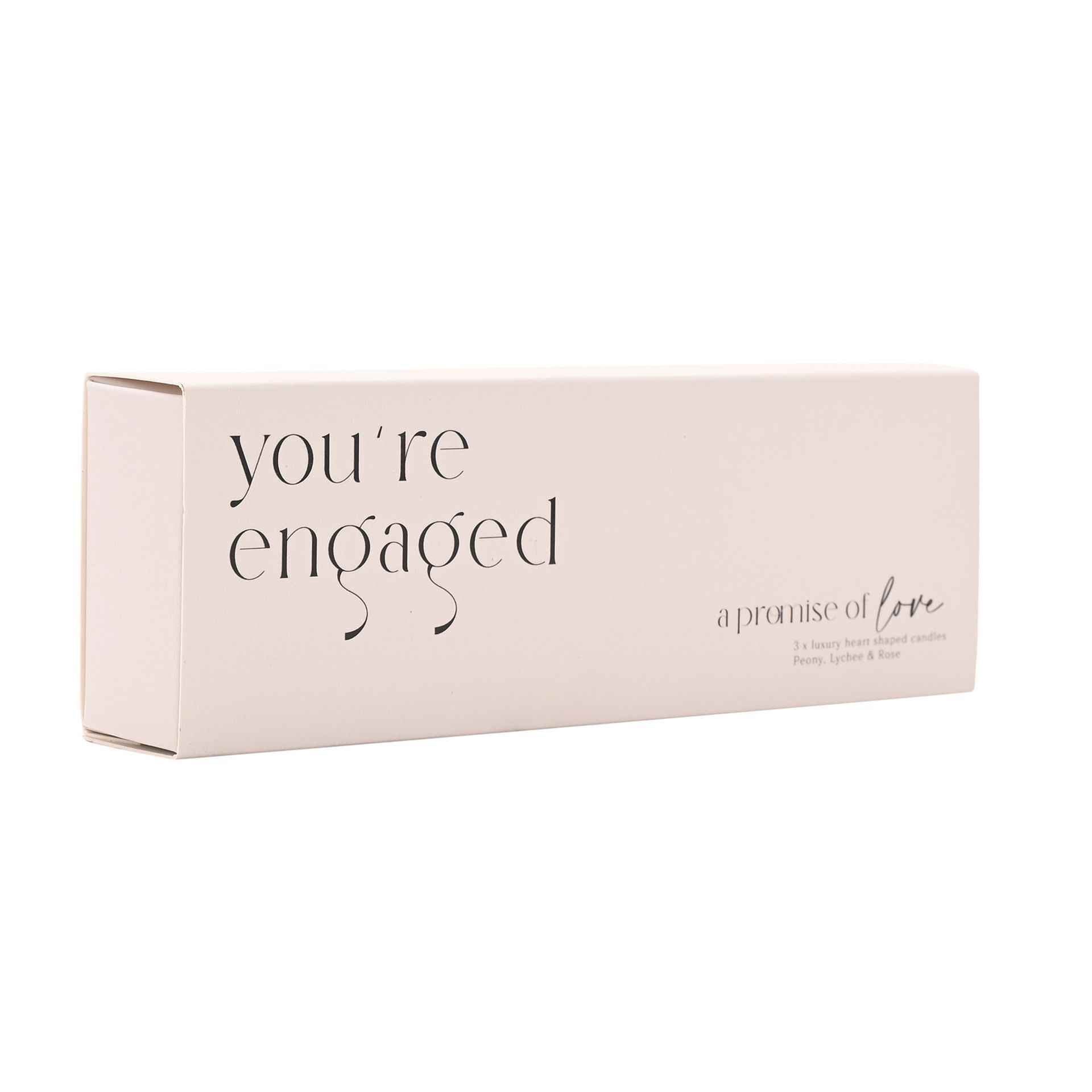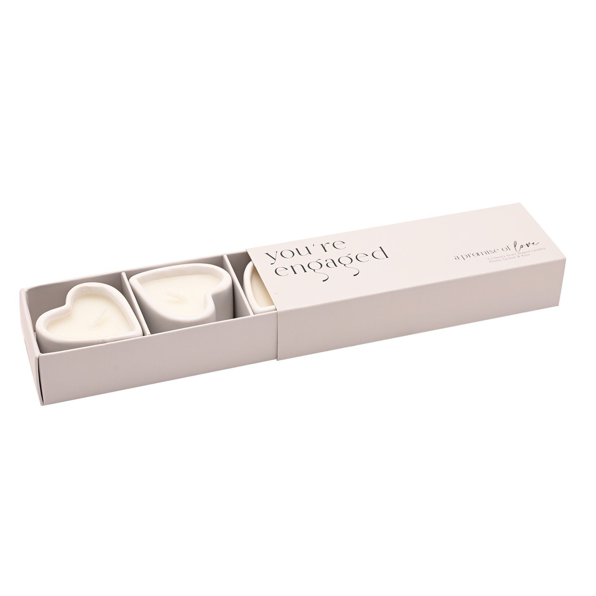 Three white ceramic heart-shaped candles are presented in an elegant slide-out box featuring the text "a promise of love", creating a meaningful keepsake. With a Peony, Lychee and Rose scent.