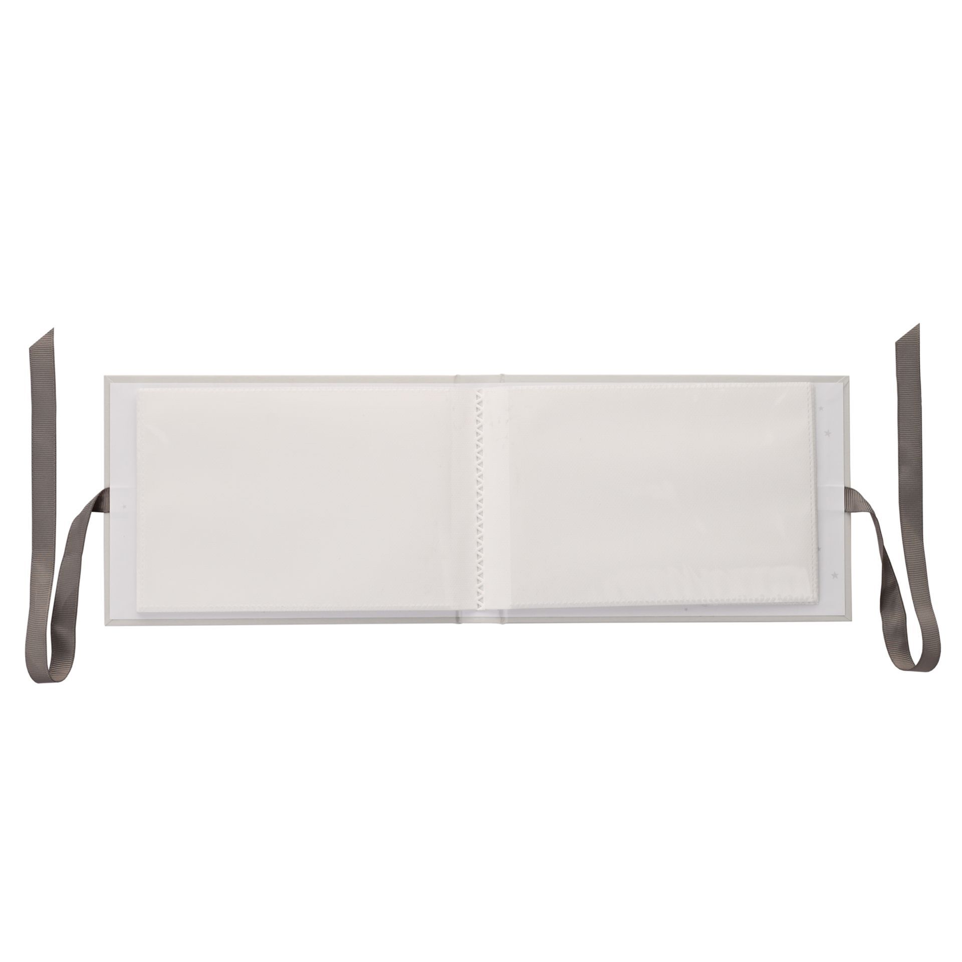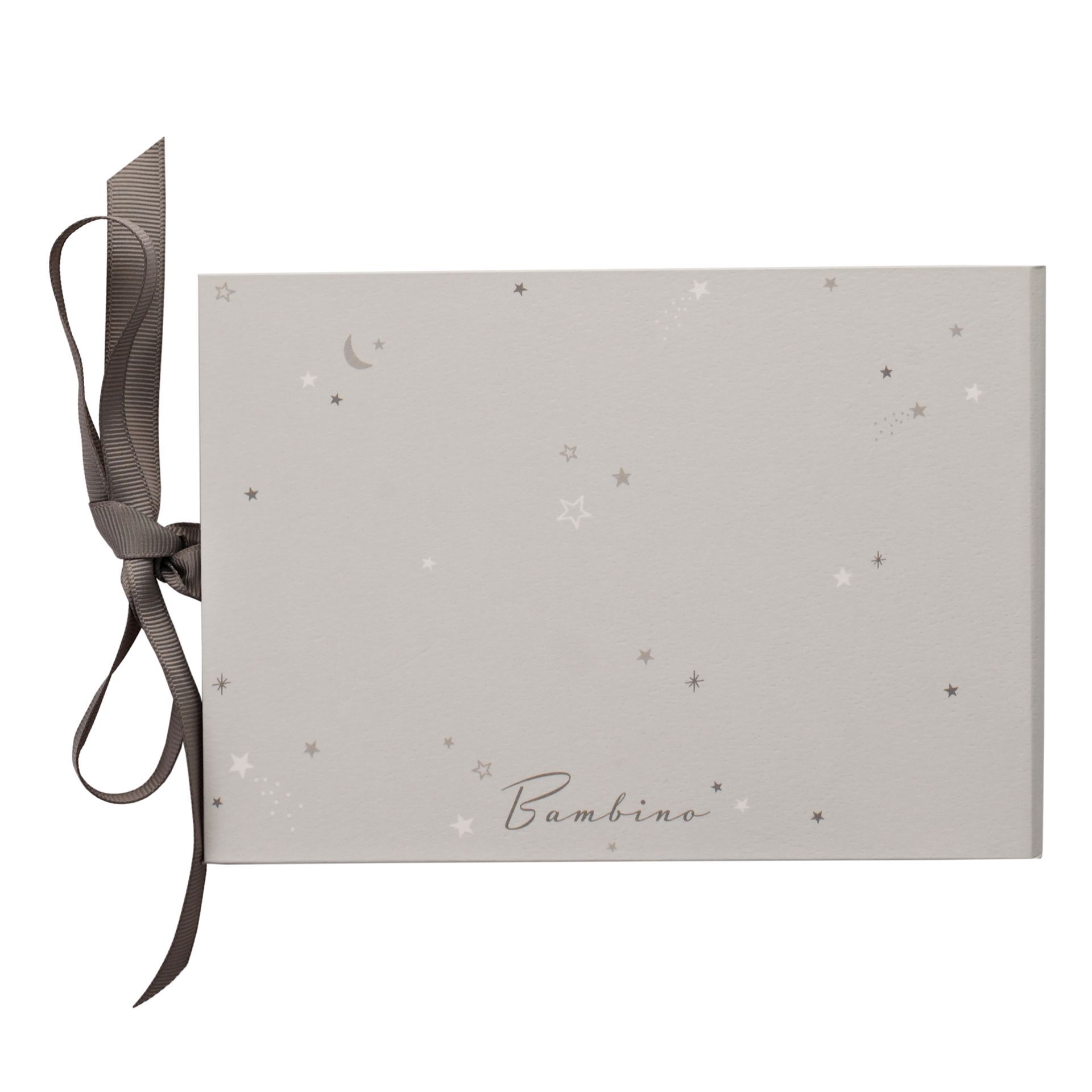 The crisp white cover features ‘starry night’ decoration, complete with ‘My Beautiful Grandchildren’ decal in gold foil lettering and crystal encrusted, silver plated teddy bear. Inside is space for fifty photographs, complete with blank space for annotations, inside cover ‘Twinkle Twinkle’ silver decal and luxury grey grosgrain ribbon for closing the album.