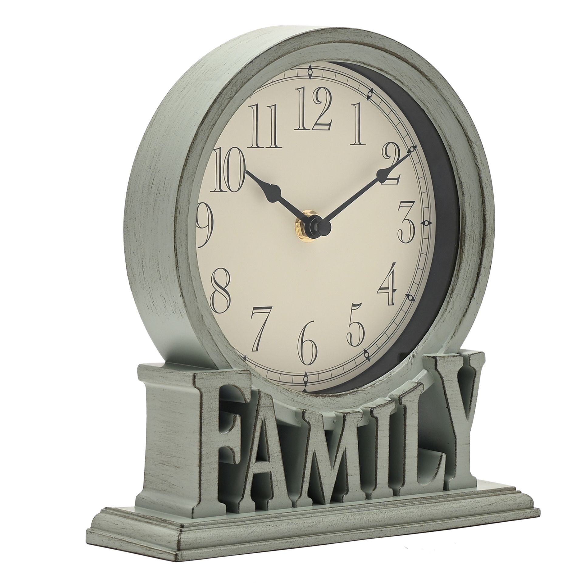 Light blue in colour, the clock face rests on a sturdy base, ensuring stability and durability. The bold ‘FAMILY' wording is prominently displayed underneath the clock face, adding a heartfelt message to any decor.