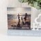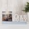 A charming 4" x 4" aperture freestanding mantel frame with white cutout 'Our Family' lettering on top of a grey baton plinth with cursive 'where life begins and love never ends' motif. A heartfelt and thoughtful item to decorate a family home.