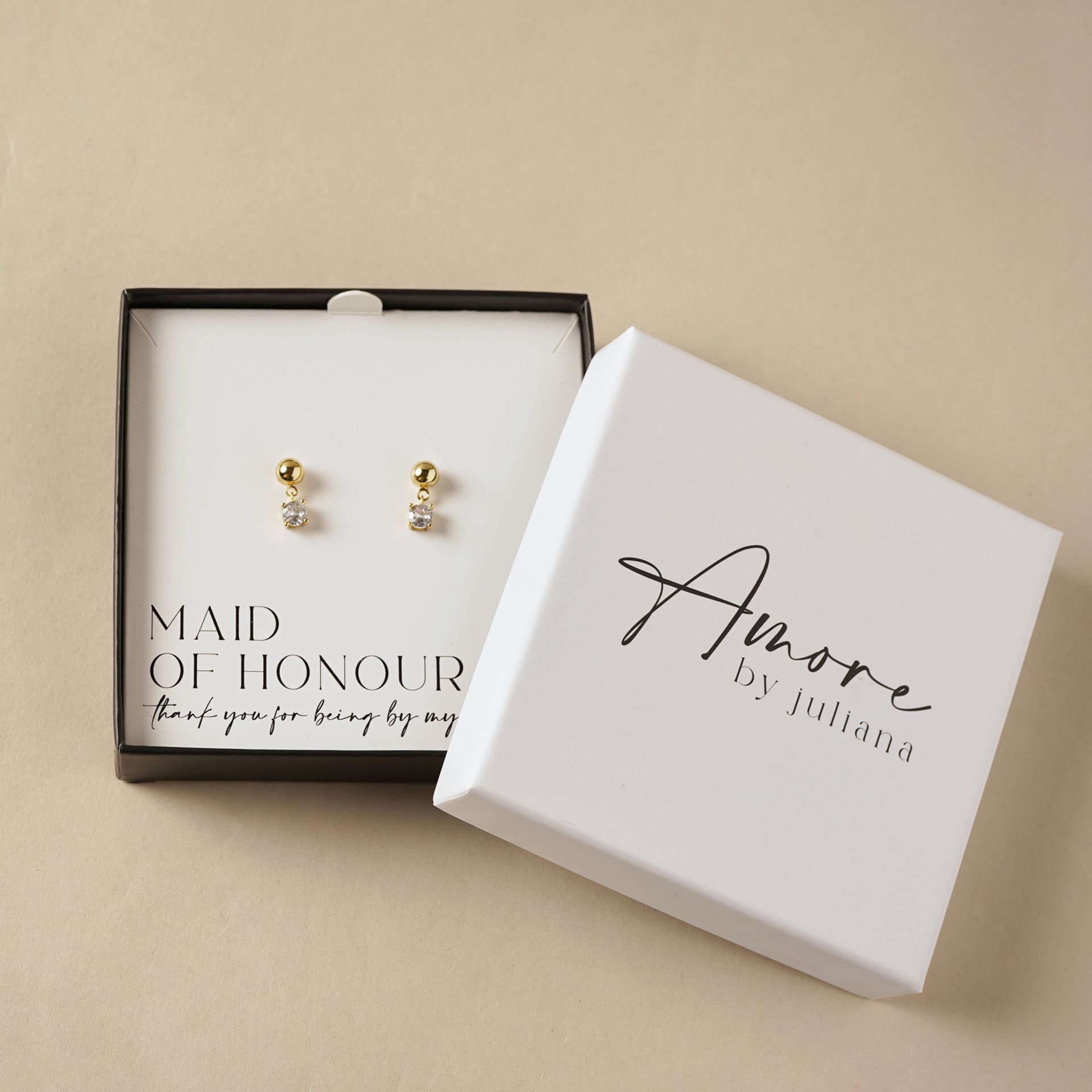 Presented in a signature Amore by Juliana® gift box, the design includes the sentiment, “Maid of Honour – thank you for being by my side” creating a thoughtful keepsake to celebrate an important milestone. The classic design ensures these earrings can be treasured long after the occasion, adding a subtle touch of elegance to any outfit.