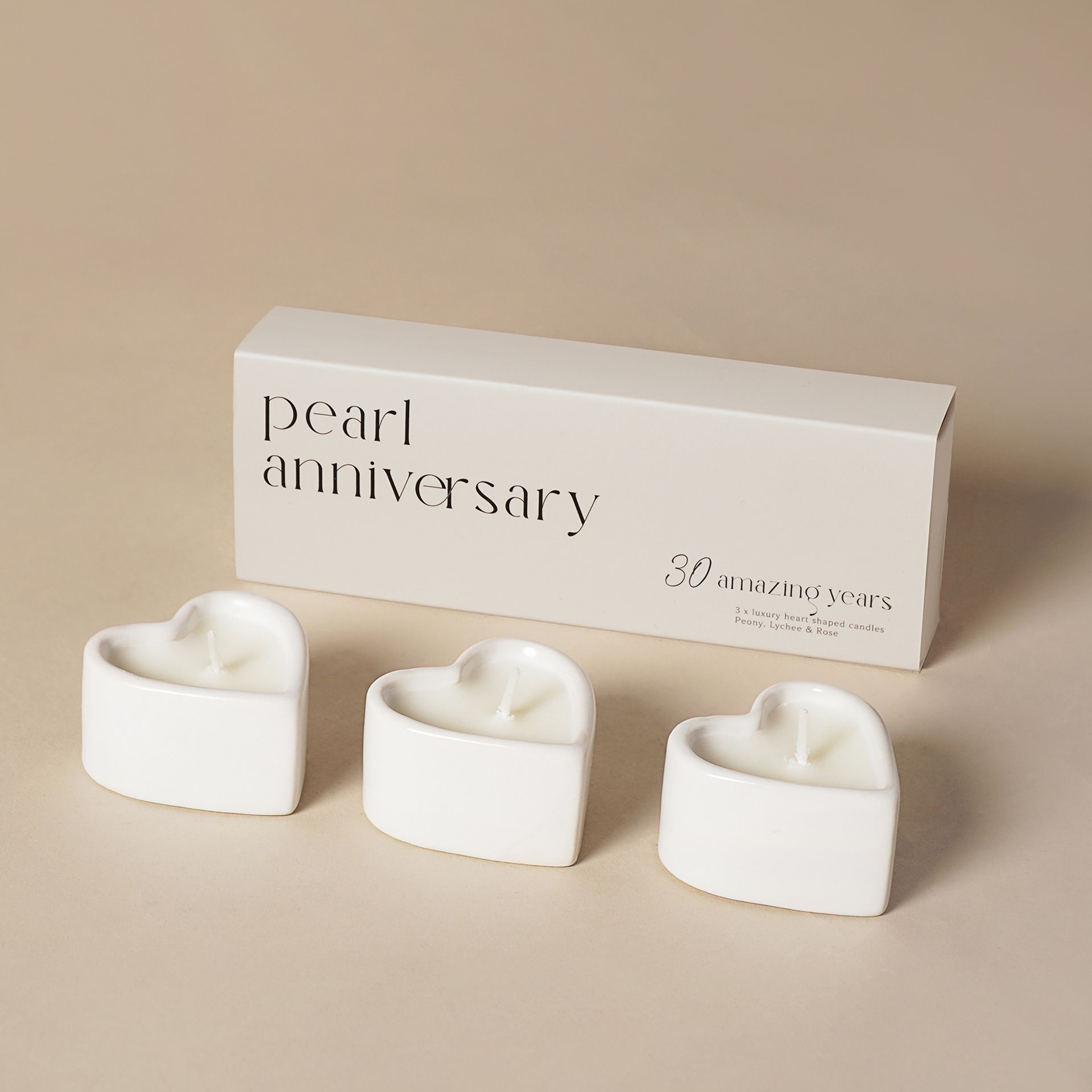 The Amore Set Of 3 Heart Candles - 30 Years is the perfect gift for celebrating special relationship milestones. Three white ceramic heart-shaped candles are presented in an elegant slide-out box featuring the text "pearl anniversary - 30 amazing years", creating a meaningful keepsake. With a Peony, Lychee and Rose scent. Burn Time: 4 hours/each Explore the Amore collection for more thoughtful gifts marking life's moments.