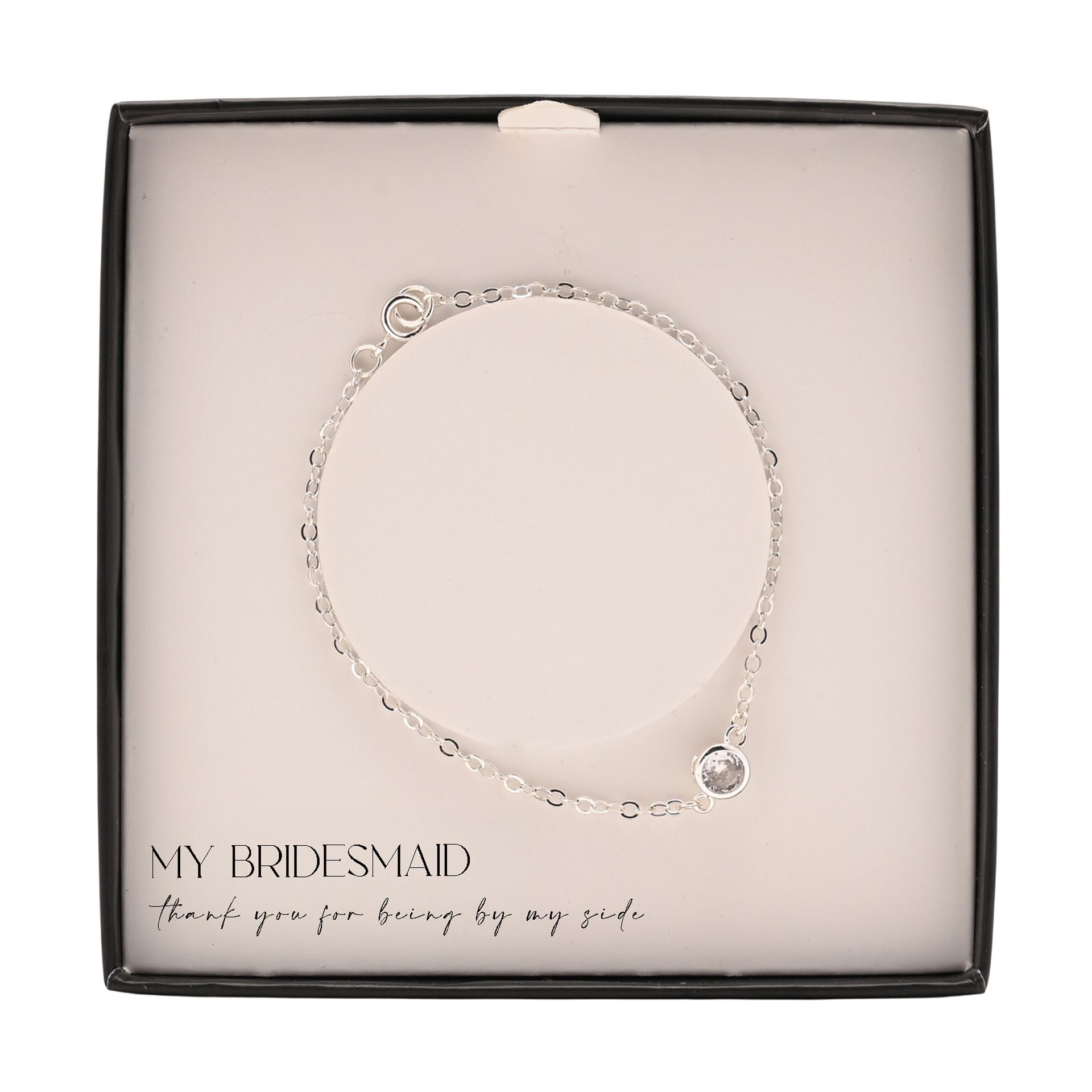 Presented in a signature Amore by Juliana® gift box, the design includes the sentiment, “Bridesmaid – thank you for being by my side,” creating a meaningful keepsake to mark the occasion. The clean, contemporary packaging enhances its presentation, making it gift-ready and ideal for bridal party gifting.