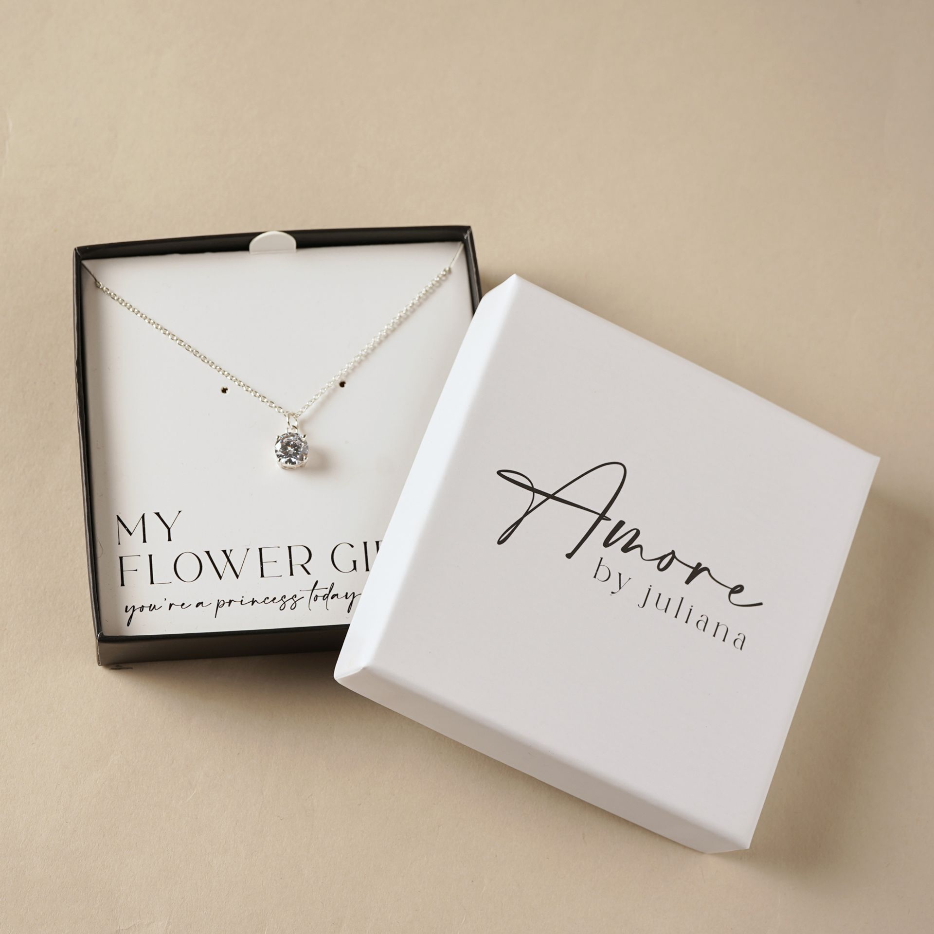 Presented in a refined Amore by Juliana® gift box, the design includes the sentiment, “Flower Girl – thank you for helping make our day so special,” creating a thoughtful keepsake to mark the occasion. The clean, contemporary packaging enhances its presentation, making it gift-ready and ideal for memorable wedding moments.