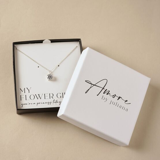The Amore Silver Plated Necklace Crystal Pendant – Flower Girl is a delicate and meaningful piece designed to celebrate a special role within the wedding party. Crafted with a silver plated finish, the necklace features a sparkling crystal pendant, offering a timeless and elegant look suitable for both the big day and beyond.