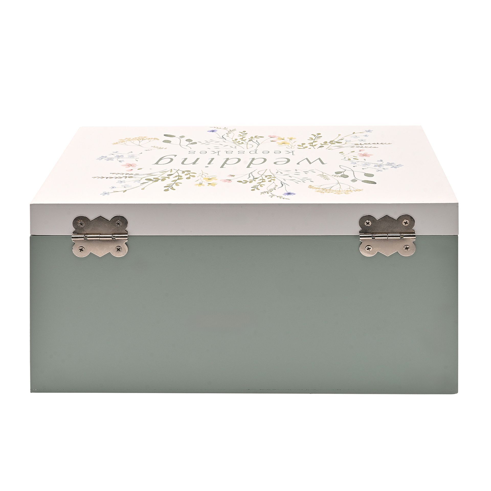 Store cherished wedding memorabilia with the Love Story Wildflower Wedding Keepsake Box. Featuring a delightful green and white colour scheme, it's adorned with an elegant floral pattern and a charming pink heart charm on the lid.