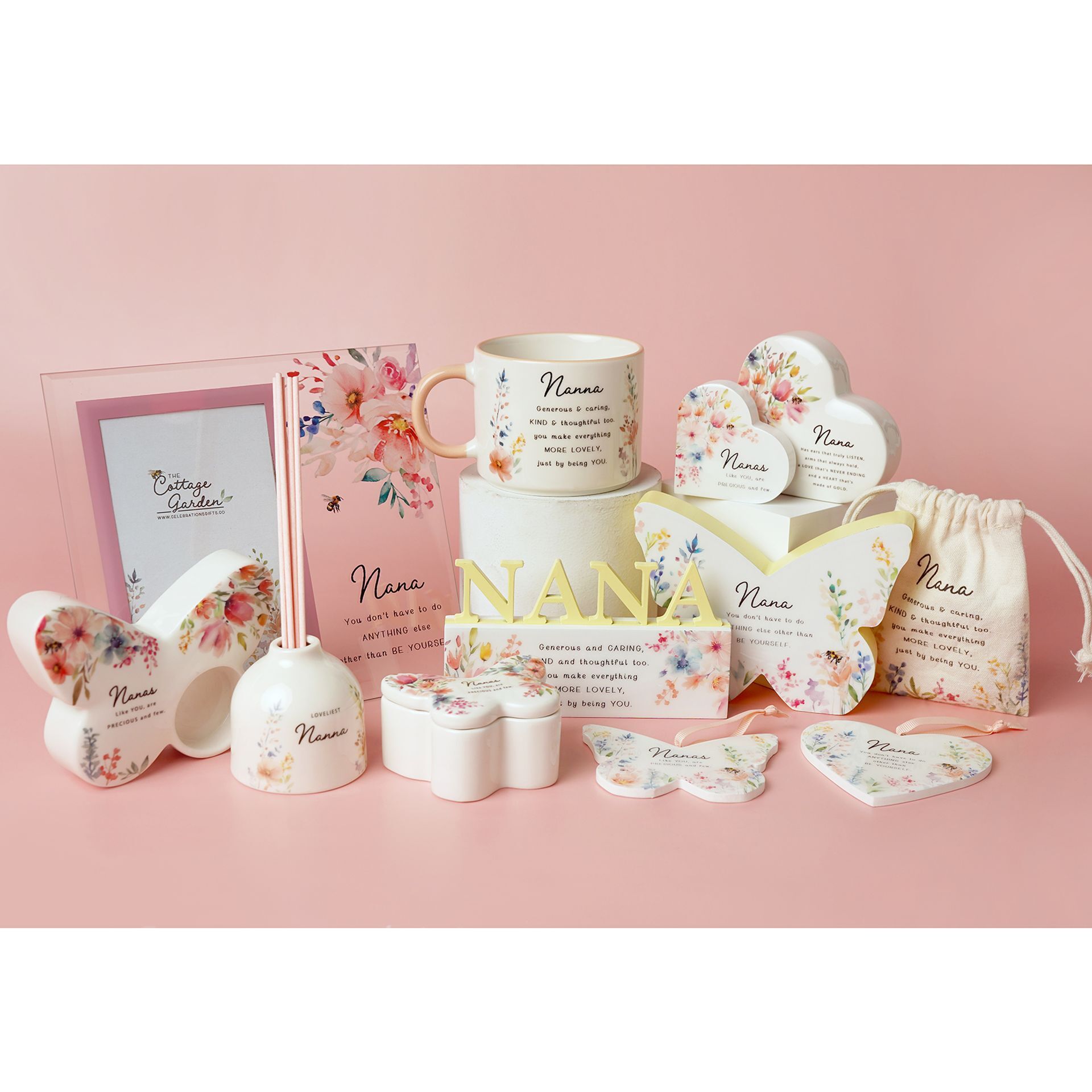 The Cottage Garden Mini Plaque - Nana is a decorative keepsake featuring soft watercolour floral artwork and uplifting wording. Compact and easy to display, each plaque comes with a coordinating drawstring bag, making it ready to give or keep.