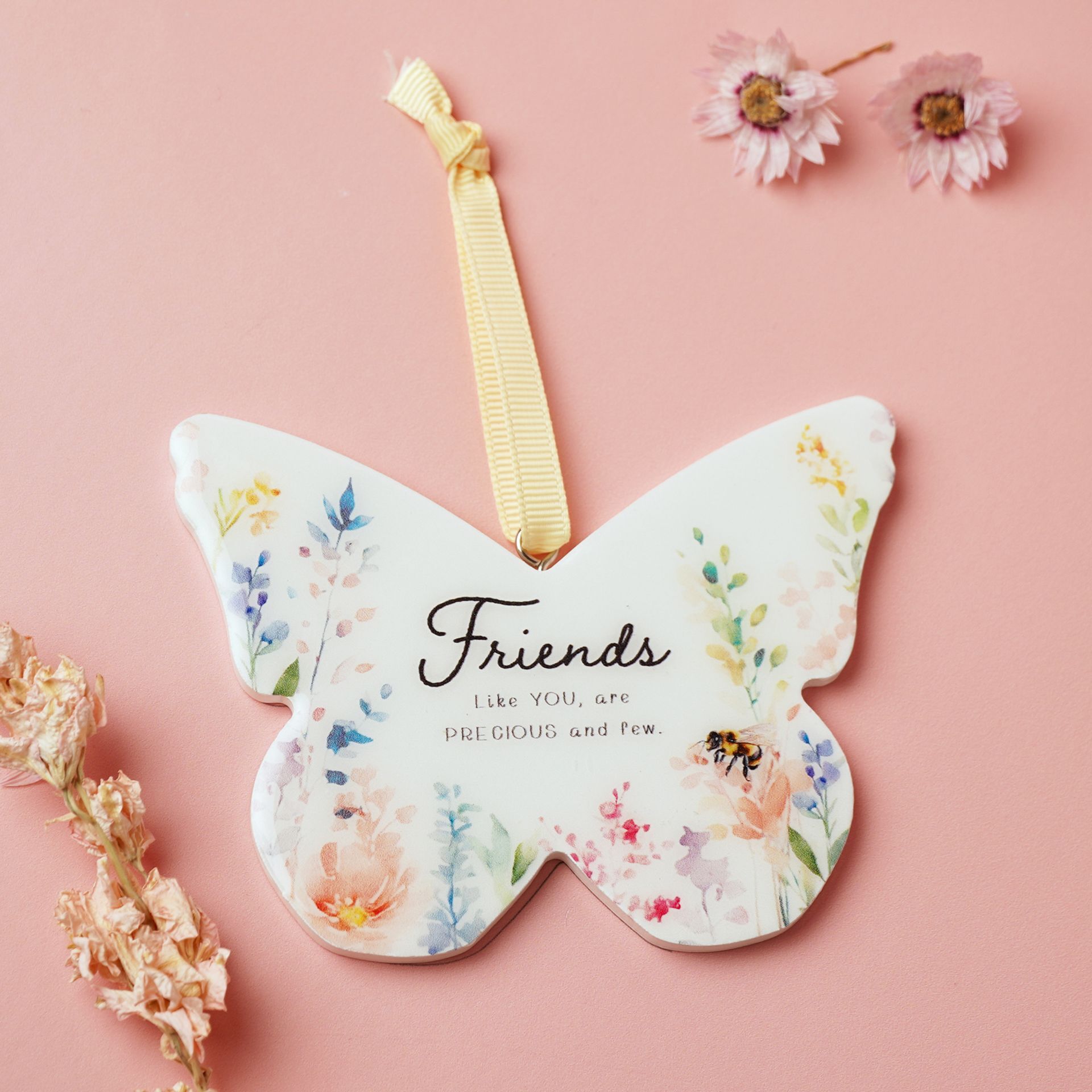 The Cottage Garden Floral Hanging Butterfly - Friends is a decorative ceramic ornament finished with soft watercolour floral artwork and uplifting wording. Complete with a ribbon for easy hanging, it adds a colourful accent to walls, handles, or display hooks around the home.