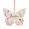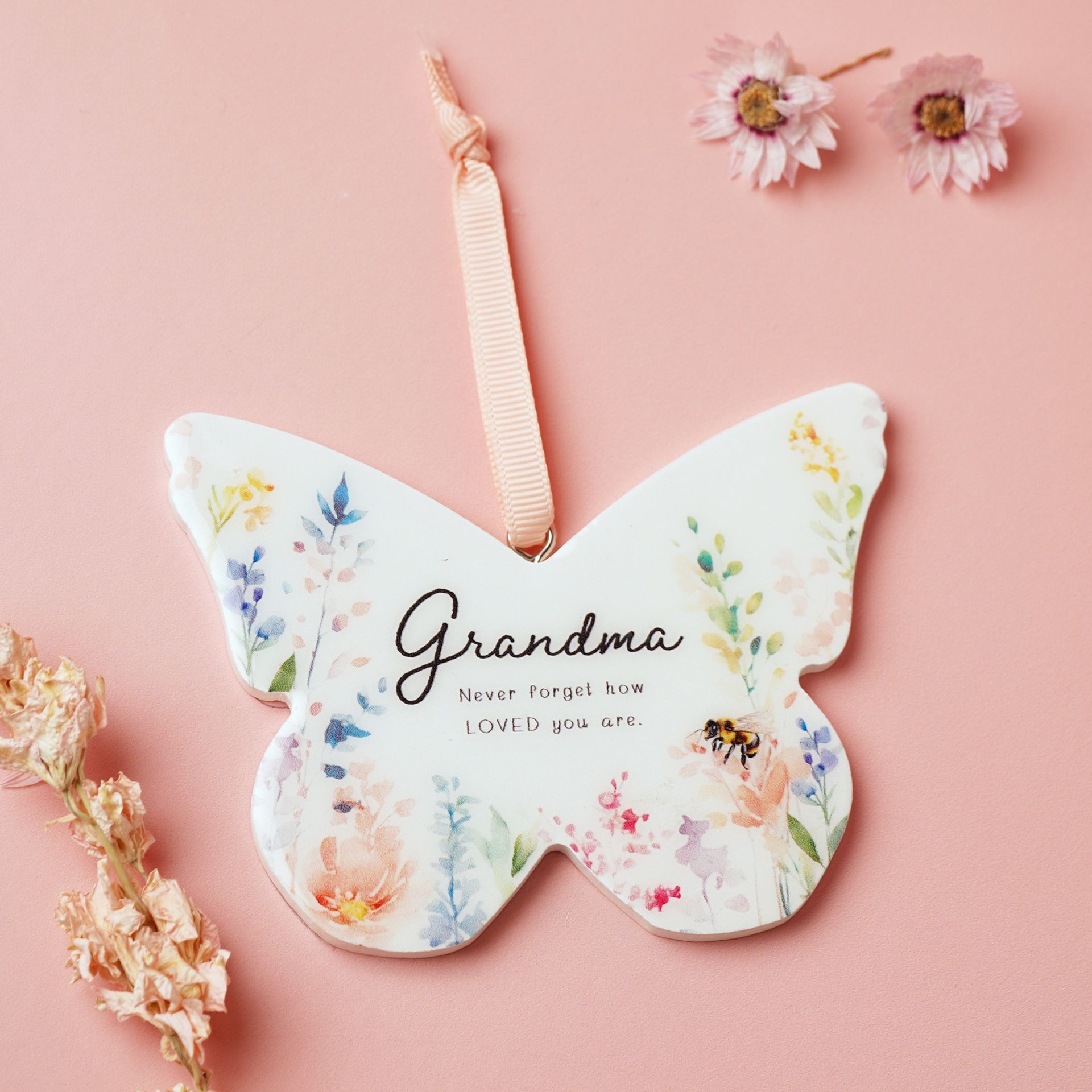 The Cottage Garden Floral Hanging Butterfly - Grandma is a decorative ceramic ornament finished with soft watercolour floral artwork and uplifting wording. Complete with a ribbon for easy hanging, it adds a colourful accent to walls, handles, or display hooks around the home.