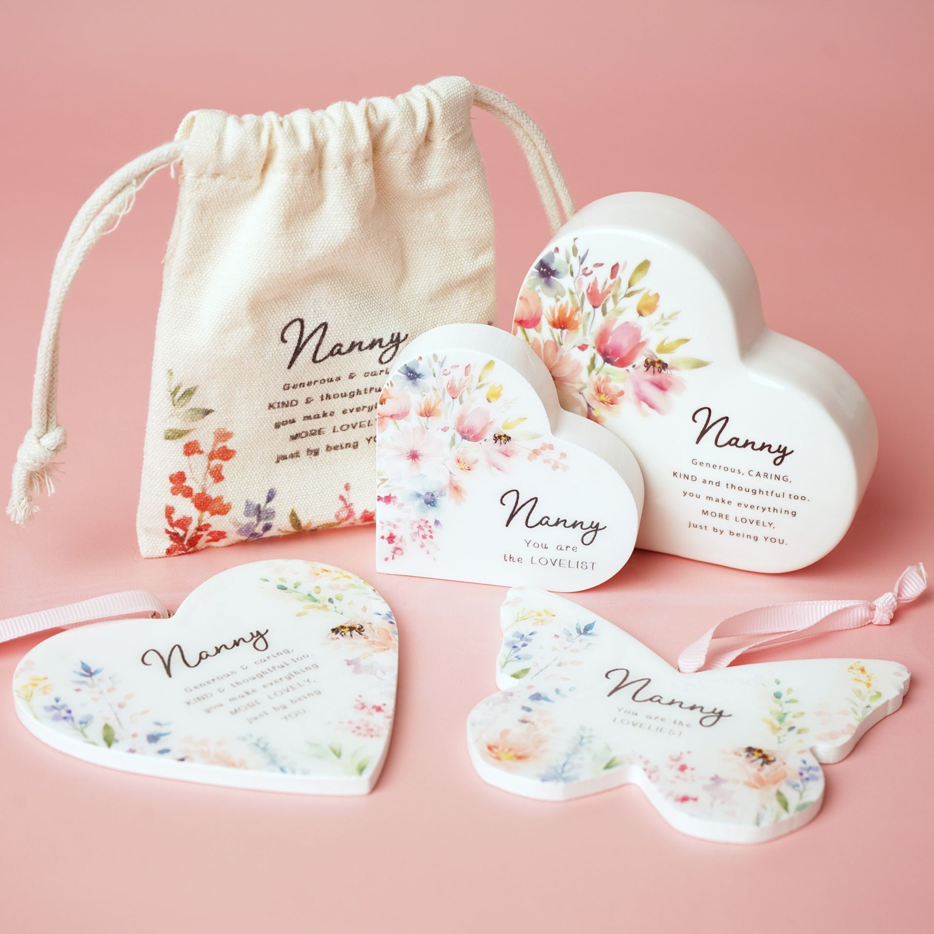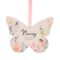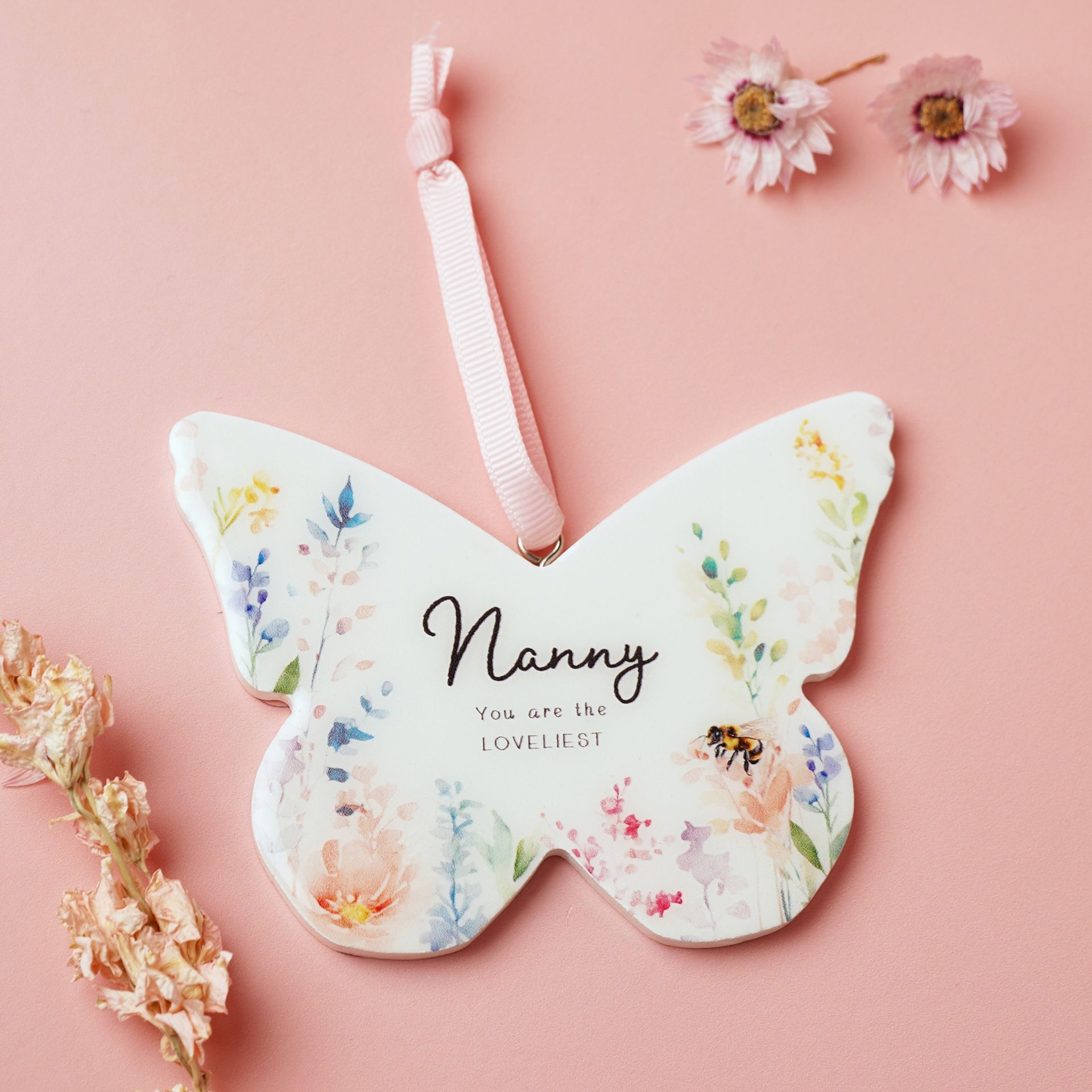 The Cottage Garden Floral Hanging Butterfly - Nanny is a decorative ceramic ornament finished with soft watercolour floral artwork and uplifting wording. Complete with a ribbon for easy hanging, it adds a colourful accent to walls, handles, or display hooks around the home.