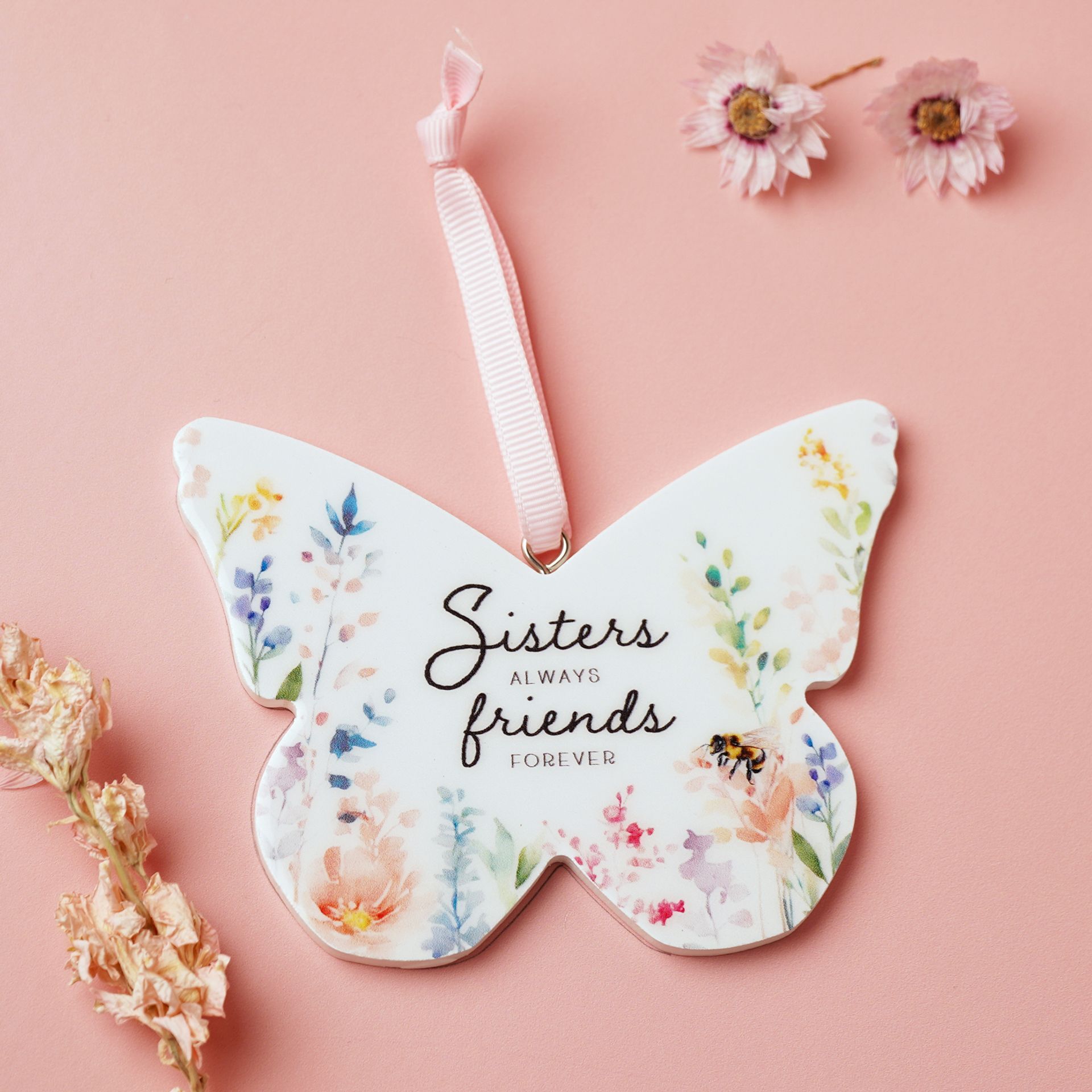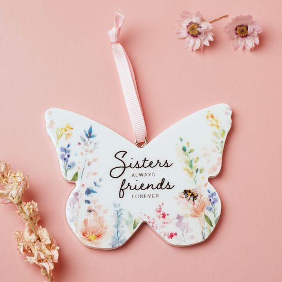 The Cottage Garden Floral Hanging Butterfly - Sisters is a decorative ceramic ornament finished with soft watercolour floral artwork and uplifting wording. Complete with a ribbon for easy hanging, it adds a colourful accent to walls, handles, or display hooks around the home.