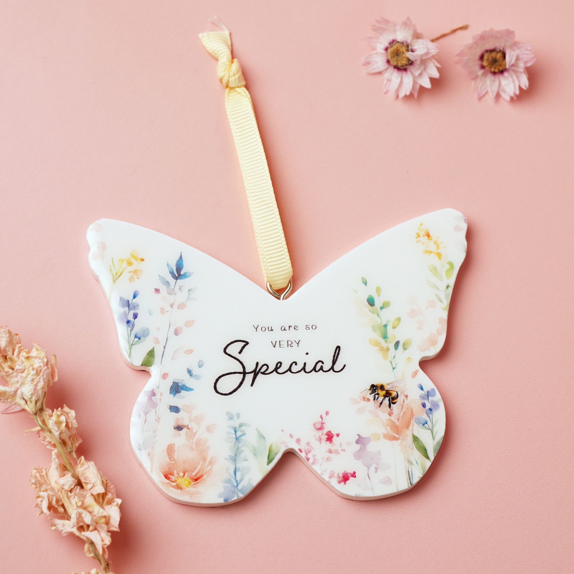 The Cottage Garden Floral Hanging Butterfly - Special is a decorative ceramic ornament finished with soft watercolour floral artwork and uplifting wording. Complete with a ribbon for easy hanging, it adds a colourful accent to walls, handles, or display hooks around the home.