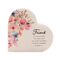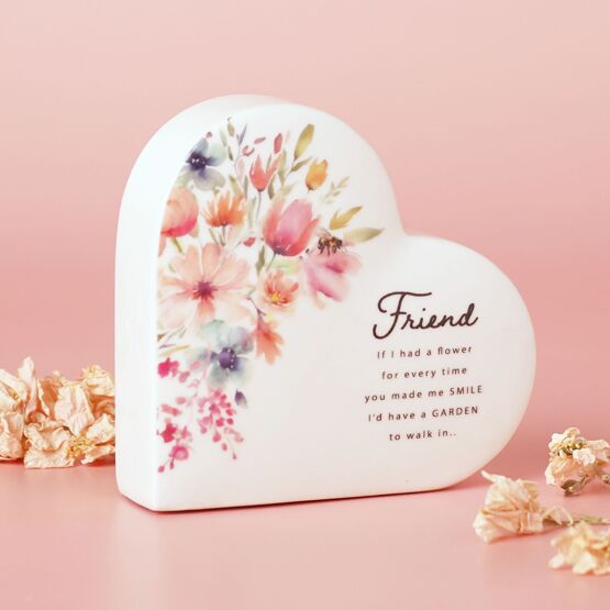 The Cottage Garden Ceramic Heart - Friend is a decorative keepsake designed to stand on shelves, desks, or bedside tables. Crafted in glazed ceramic, it features soft watercolour floral artwork paired with uplifting wording.