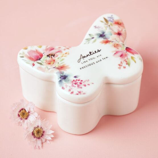 The Cottage Garden Trinket Box - Aunties Like You is a butterfly-shaped ceramic keepsake finished with soft watercolour floral artwork and uplifting wording. Compact and practical, it’s the perfect spot for storing jewellery, small treasures, or everyday essentials.