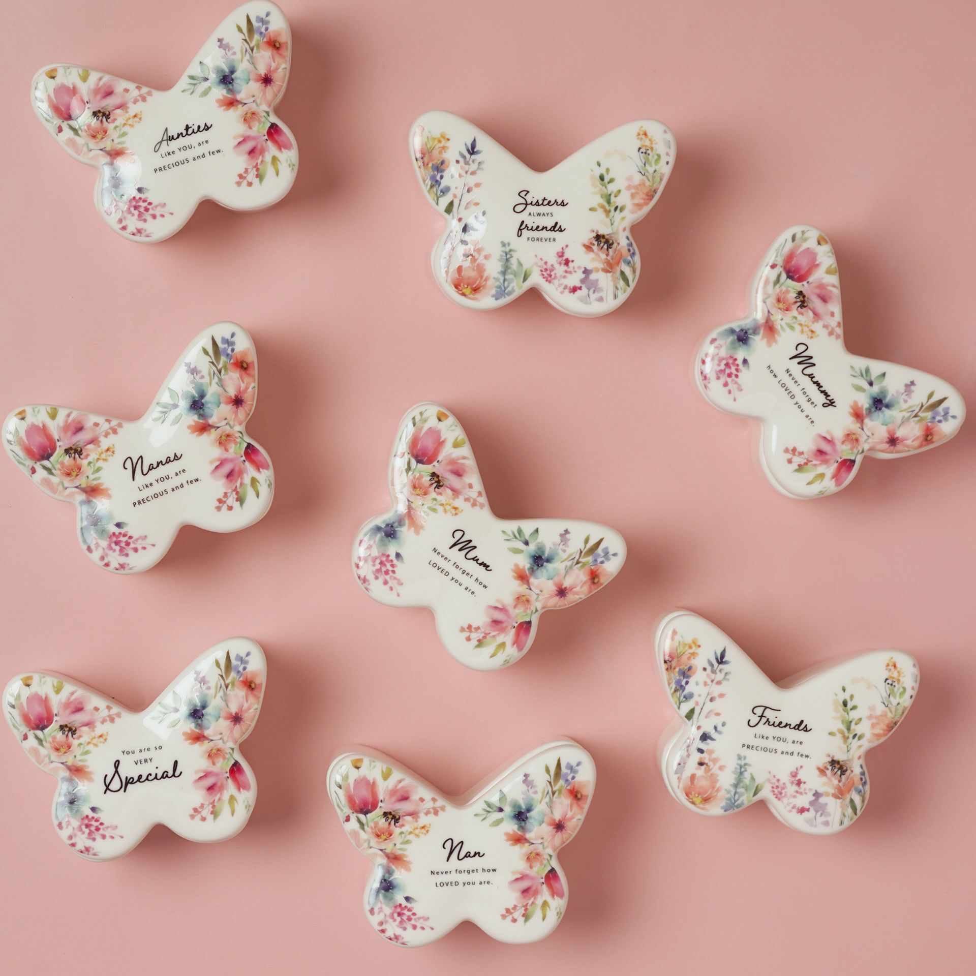 The Cottage Garden Trinket Box - Nan is a butterfly-shaped ceramic keepsake finished with soft watercolour floral artwork and uplifting wording. Compact and practical, it’s the perfect spot for storing jewellery, small treasures, or everyday essentials.