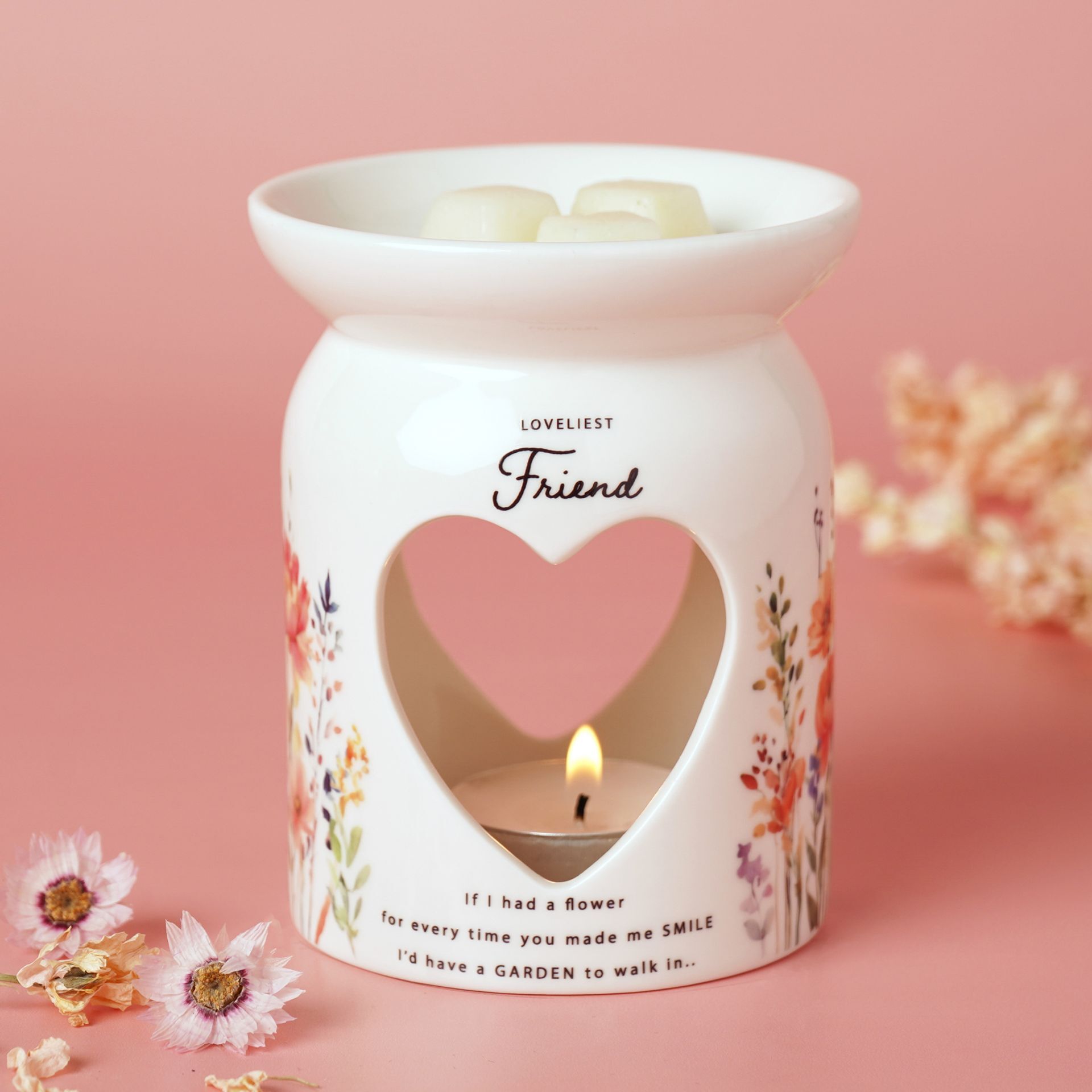 Each ceramic burner features a heart-shaped cut-out and delicate floral design, paired with heartfelt titles such as Mum, Mummy, Lovely, Friend, and Thank You. Simply add a wax melt to the dish and enjoy a cosy glow as the scent fills the room.