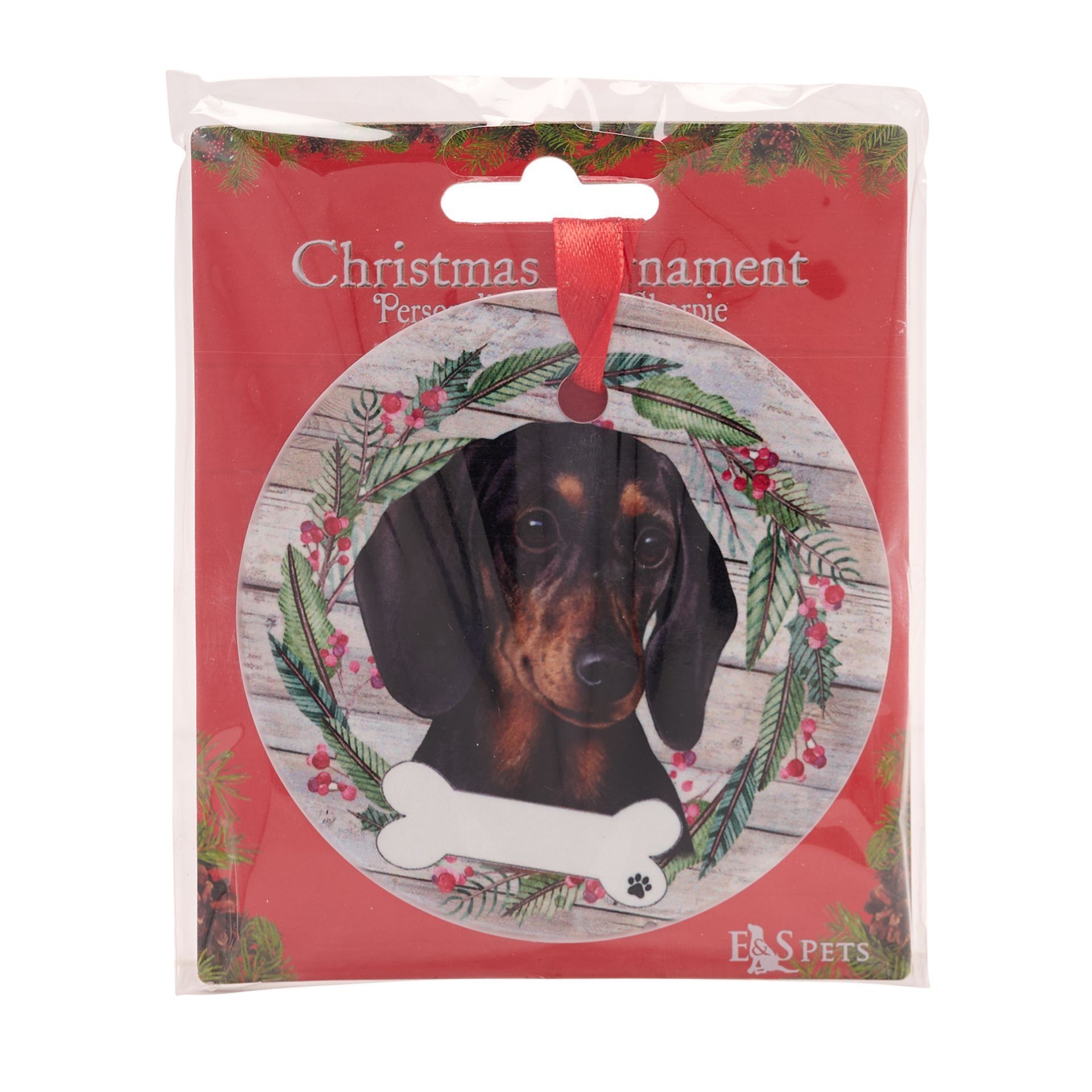 A round ceramic hanging decoration of a Dachshund, from E&S pets by Best of Breed. 9cm in diameter and ready to be personalised within a bone shaped space, with a loved one’s pet name. A beautiful, printed decal of the dog breed surrounded by festive wreath, and finished with a red ribbon. Each decoration is individually packaged with protective sleeve and a euro hook for ease of merchandising.