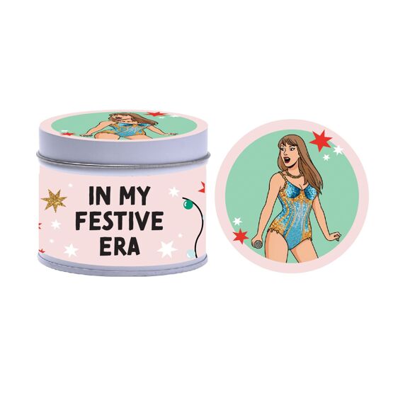 This tin candle has an iconic image and the text "In my festive era." Thecheerful motif and bold lettering evoke a sense of nostalgia and light-hearted fun, perfect for seasonal gifting or display.
