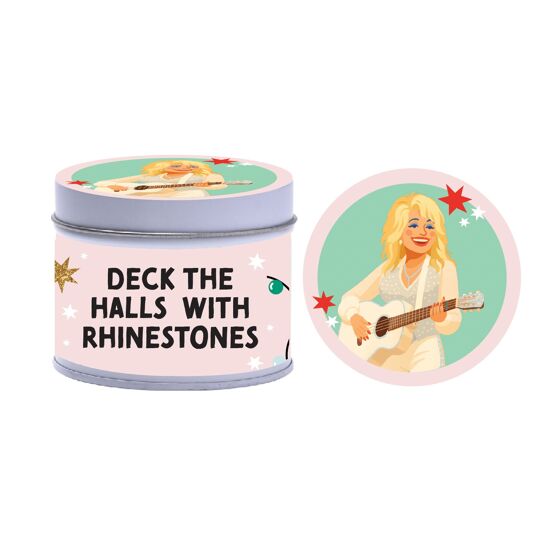 This tin candle has an iconic image and the text "Deck the halls with rhinestones." Thecheerful motif and bold lettering evoke a sense of nostalgia and light-hearted fun, perfect for seasonal gifting or display.