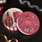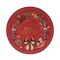 A festive, circular design featuring Christmas-themed elements such as nutcracker soldiers, holly, poinsettia, and a ribbon-adorned wreath against a rich red background sets the tone. Playful patterning captures retro Christmas charm.