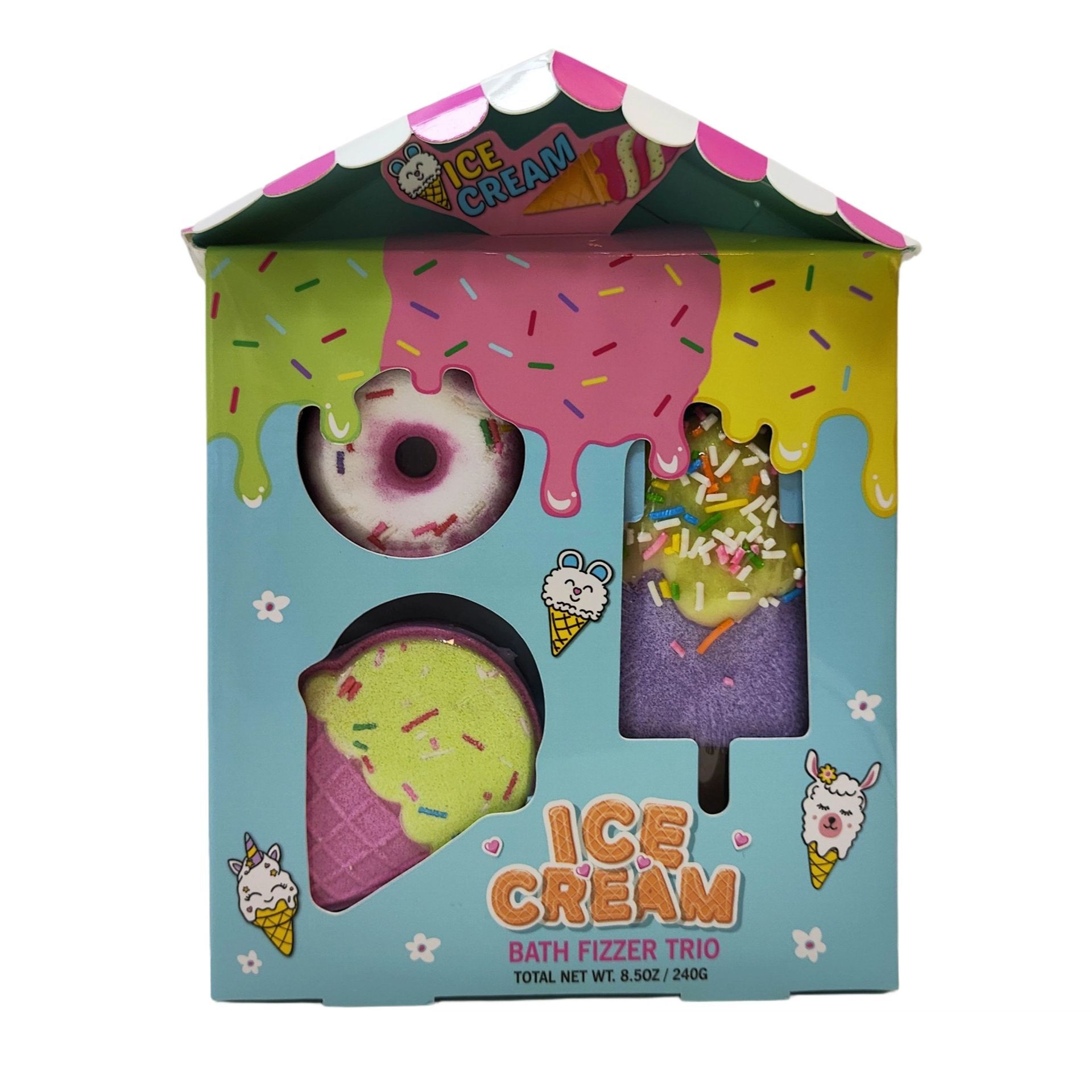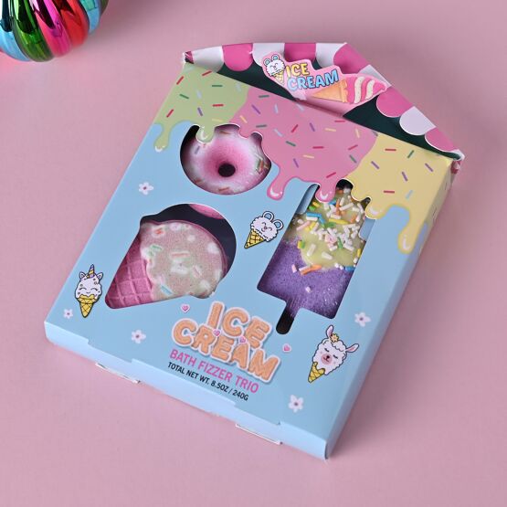 The Set of 3 100g Bath Fizzers in Donut, Ice Cream and Lollipop Shape and Sweet Shop Packaging is a colourful trio of sweet-shaped bath fizzers in a gift-ready pack.