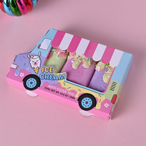 Set of 3 100g Bath Fizzers in Lollipop Shape and Ice Cream Van Packaging