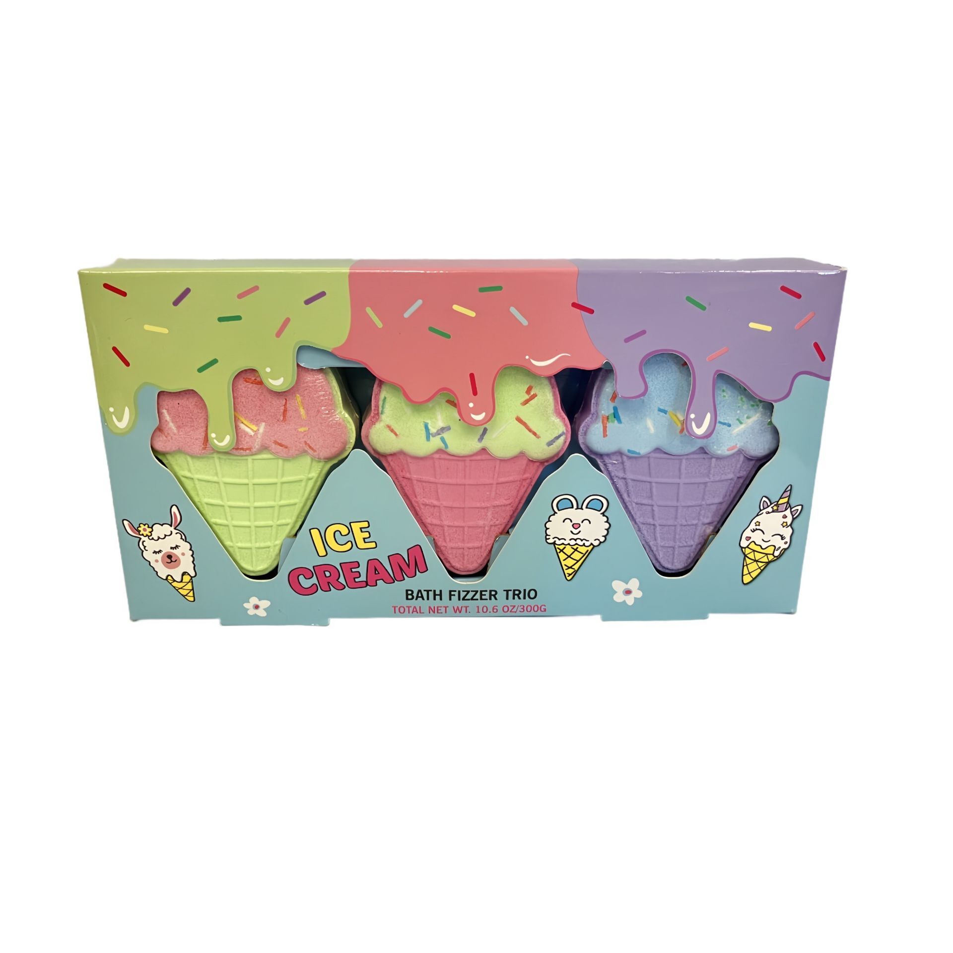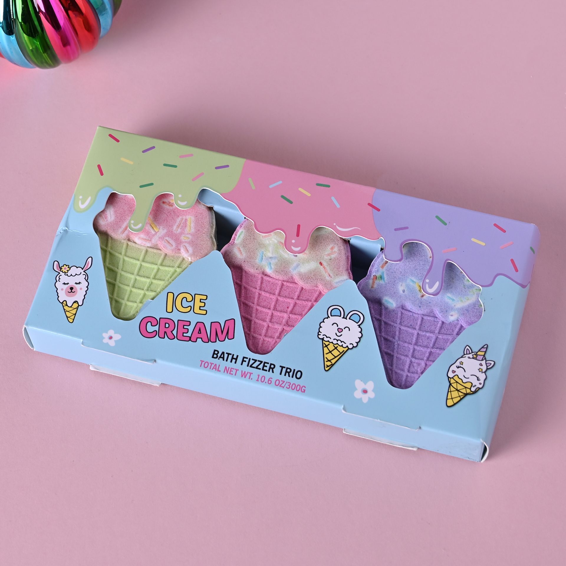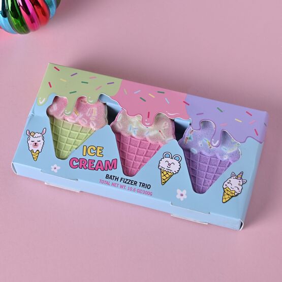 The Set of 3 Ice Cream Bath Fizzers in Sweet Shop Packaging is a novelty trio styled for the Whimsical Wonderland range, finished with retro showtime flair.