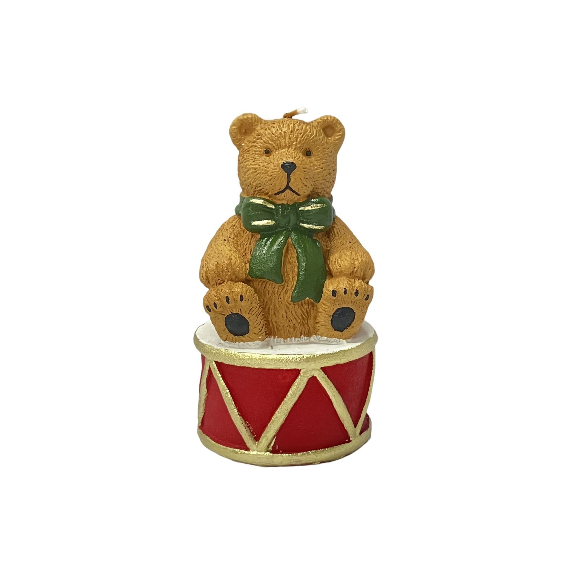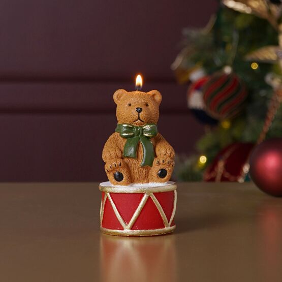 The Bear Sitting On Drum Candle brings a playful spirit to festive decor, blending whimsy with a touch of tradition. A charming plush teddy bear perches atop a red and white drum, adorned with a green bow for added festivity. Metallic accents enhance the cheerful sculpt, while the wax candle base provides subtle warmth and ambiance to any setting. Pair it with other refined designs from the Regal Tidings collection to create a cohesive and elegant seasonal display.